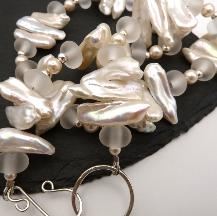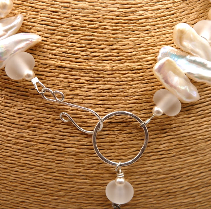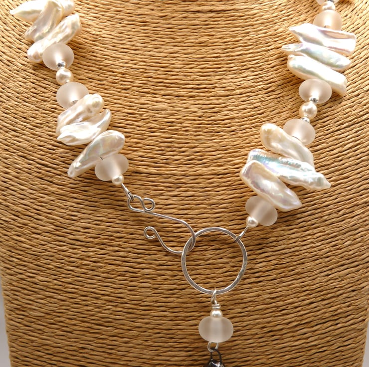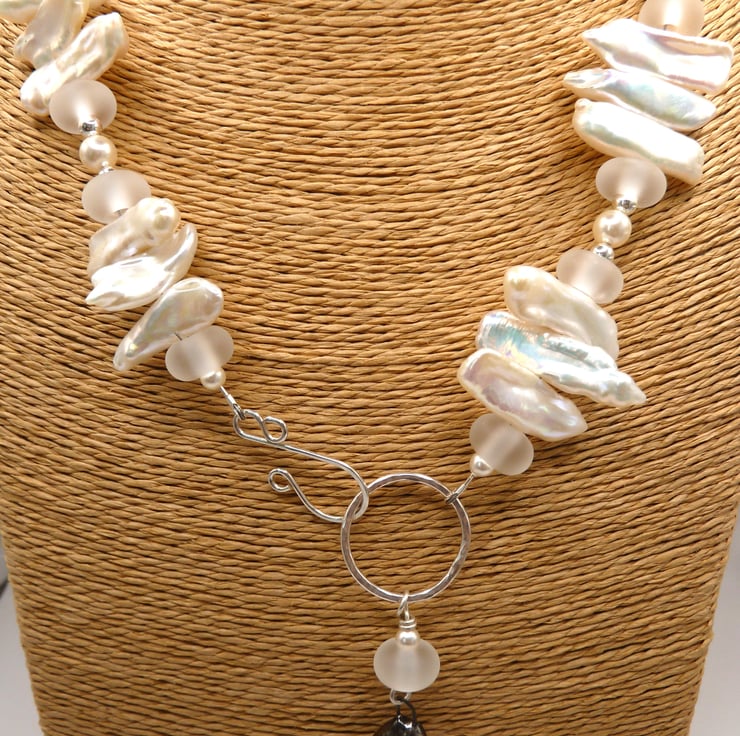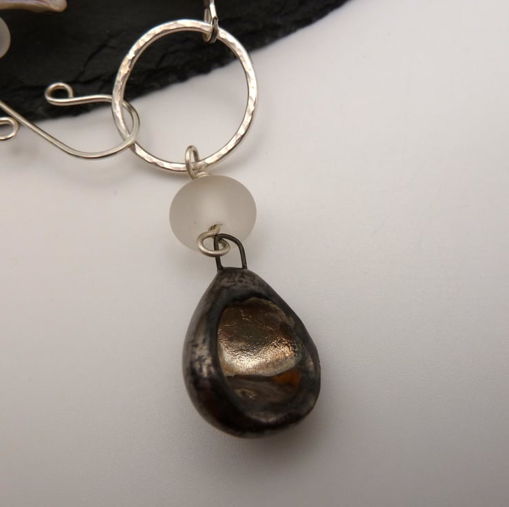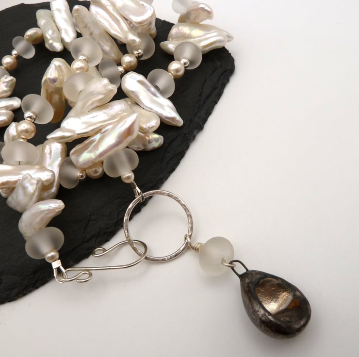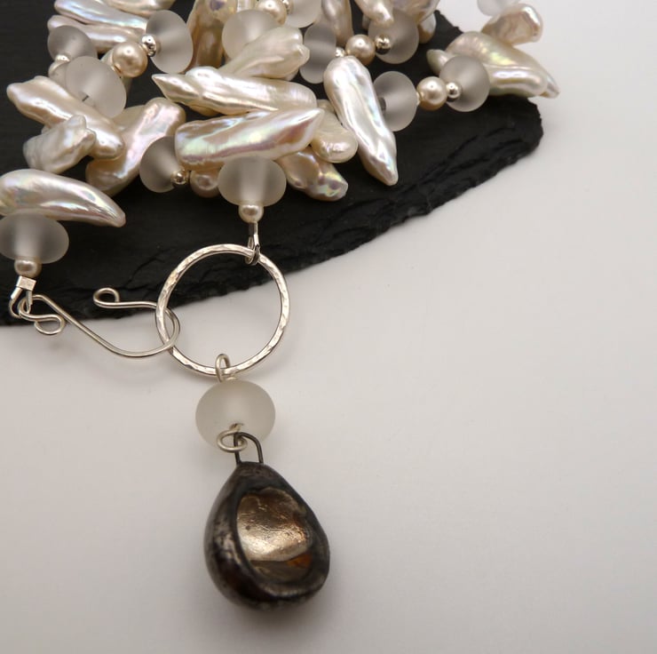 A necklace strung with Bica pearl, Freshwater pearl, sterling silver beads and handmade lampwork glass beads. It features a handmade ceramic rock pool pendant and has a sterling silver hoop where it fastens at the front.