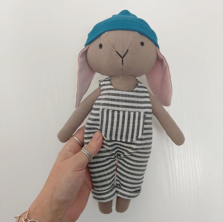 This adorable bunny is seeking a new home. Handmade from a soft brown linen with strokeable pink cotton velvet lined ears, it is wearing a pair of black and white linen stripey dungarees with a teal beanie. It is stuffed with British Standard toy safe polyester filling and the clothes are removeable and fastened with velcro at the back.
