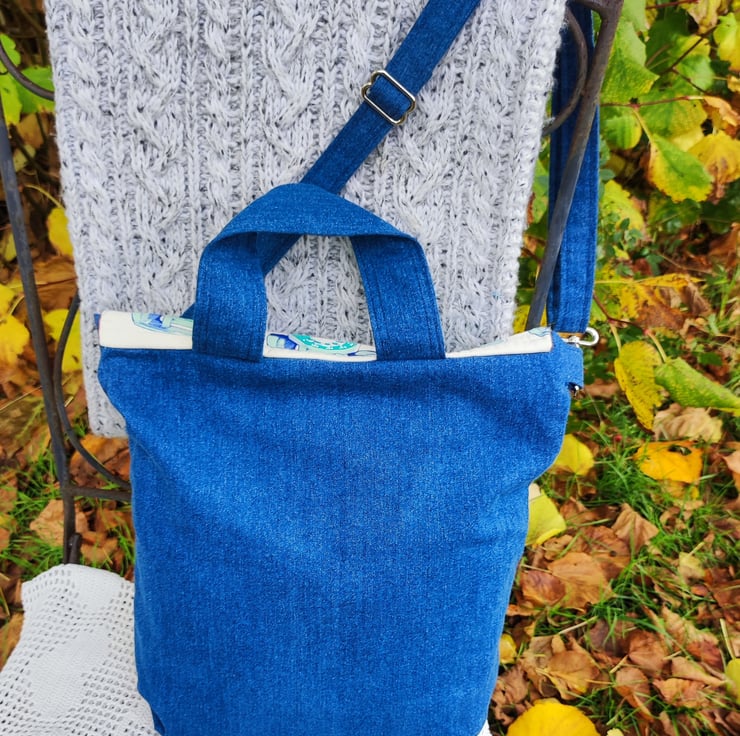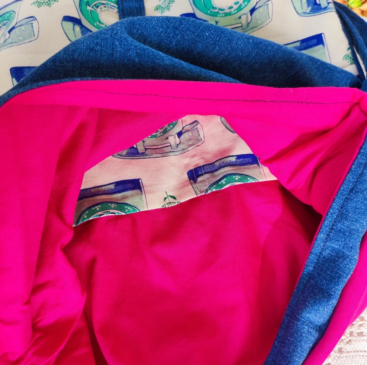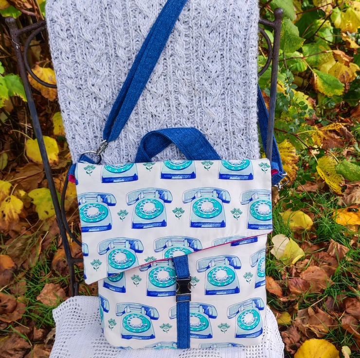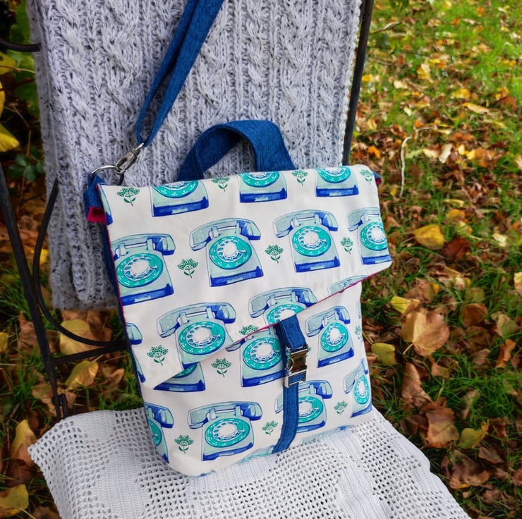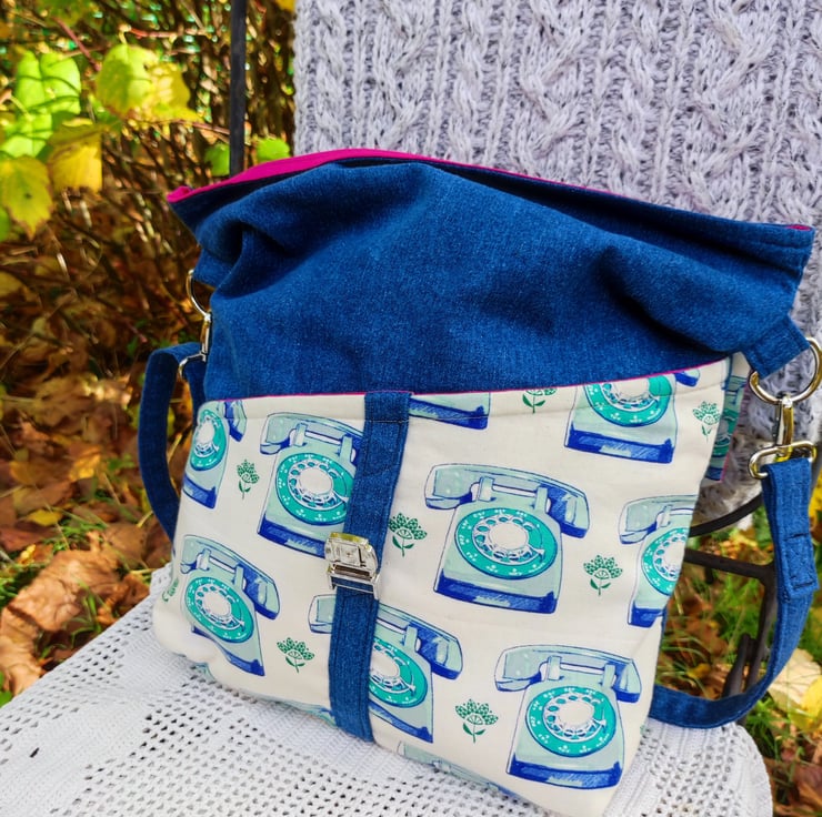 The quirky phone fabric is combined with blue denim for the outside and a hot pink lining!