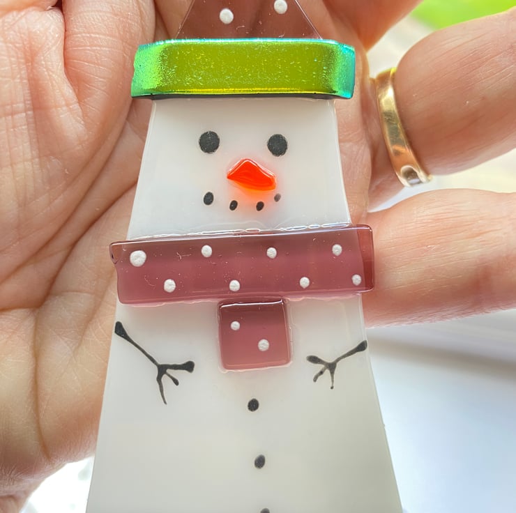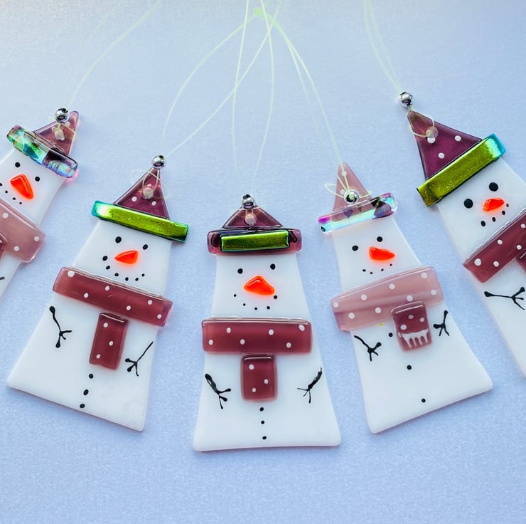 Just gorgeous these are the glamorous snowladies ! As snowmen can’t have all the fun ! . They are approximately 3,5 in tall and are strung with clear wire and a small silver coloured bead . Each comes ready to hang in its own taffeta bag . Perfect fused glass decoration to give as a gift or to hang on your tree .