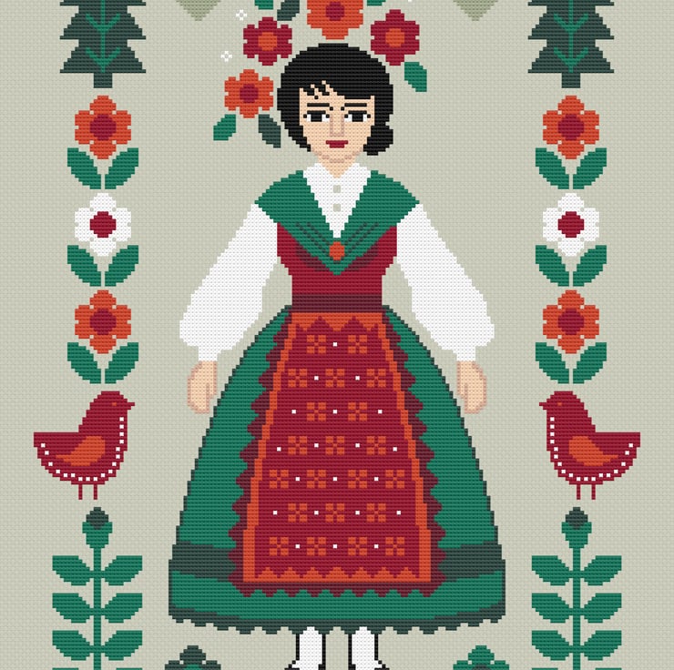 Nordic Folk Traditional Costume Girl with Flowers in hair - Scandinavian graphic style cross stitch PDF chart by Vivienne Powers - 052A