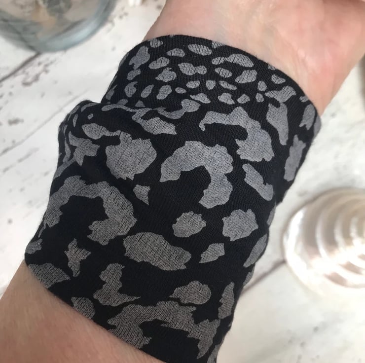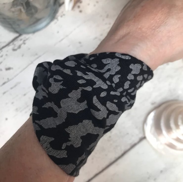 Lightweight pattern black cuff. A popular make. Stylish wide wrist cover up twist bracelet. A black design in lovely lightweight stretch polyester fabric.