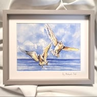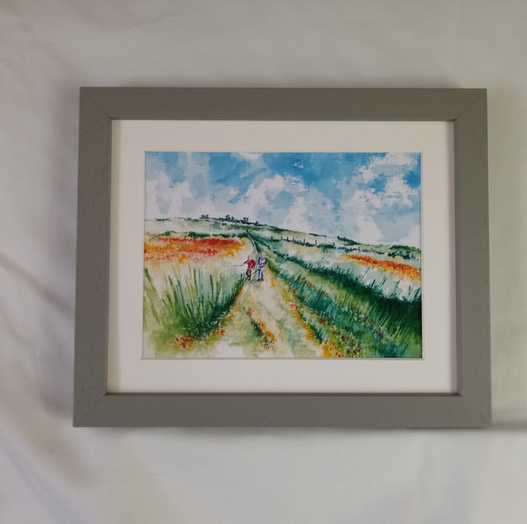 An original illustrated watercolour print of children on the Southdowns Sussex. Presented and signed in a mounted Grey wooden frame with a grain finish 10" x 8" (print: 8" x 6") 22mm wide and 22mm deep. Also presented unframed, fully mounted ready for your own frame. (10" x 8" Mount-Print 8" x 6")