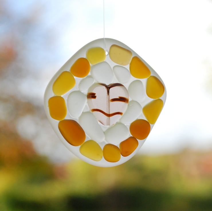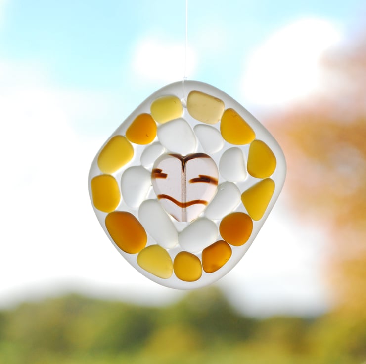 A beautiful pink heart is surrounded by beach glass mosaic pieces in this charming little sun catcher. The tumbled beach glass has come from old bottles and each piece is slightly curved, giving the sun catcher a three dimensional quality. The back of the hanger is the bottom of an old bottle, also tumbled glass from the beach and slightly curved.