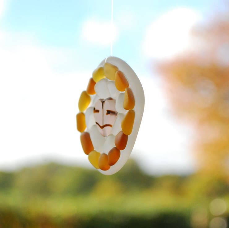 Our sun catchers are individually hand made in Chudleigh, Devon. We collect our materials ourselves, mainly from local beaches. Each piece of glass is unique, so each sun catcher is unique. We only use materials which have rounded edges, which is why we tumble pieces which have rough edges (this continues the process begun by the waves) until they are smooth.