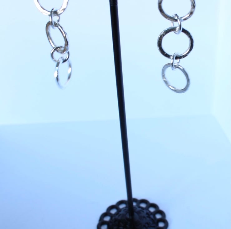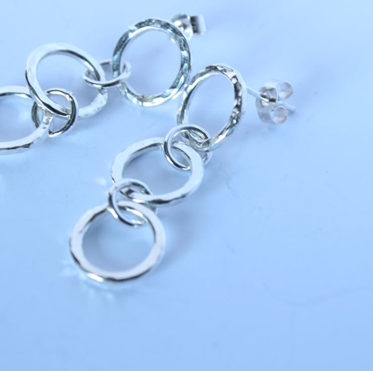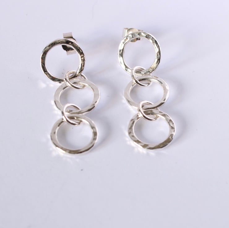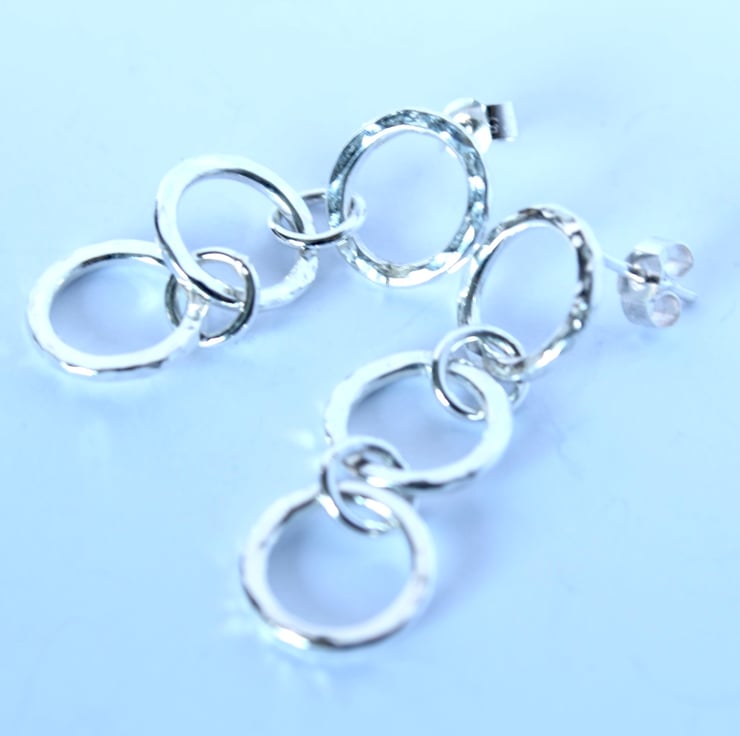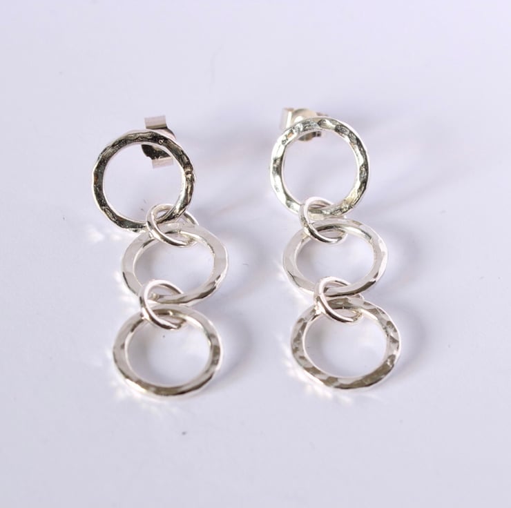 3 hand made and textured links are joined by hand made sterling silver jump rings. The design has lots of movement to catch the light.