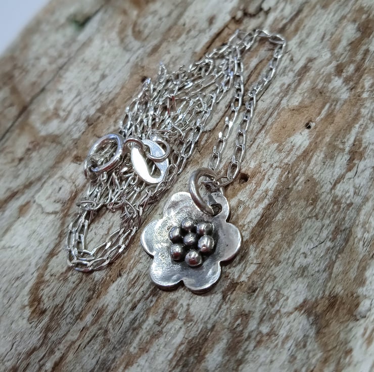 I have hung the flower pendant by a soldered sterling silver jump ring from an 18 inch chain necklace made from 100% recycled sterling silver.