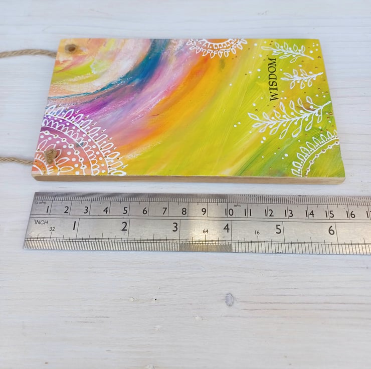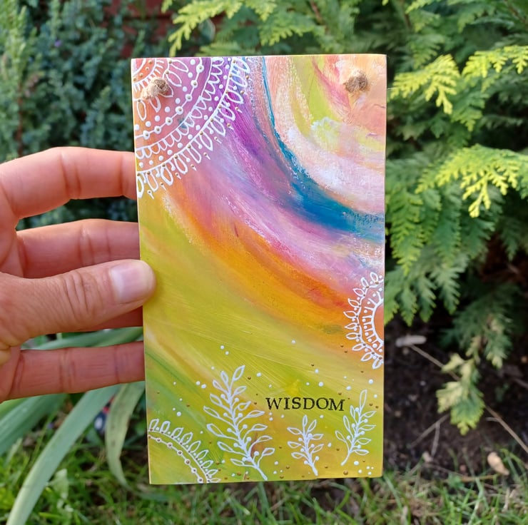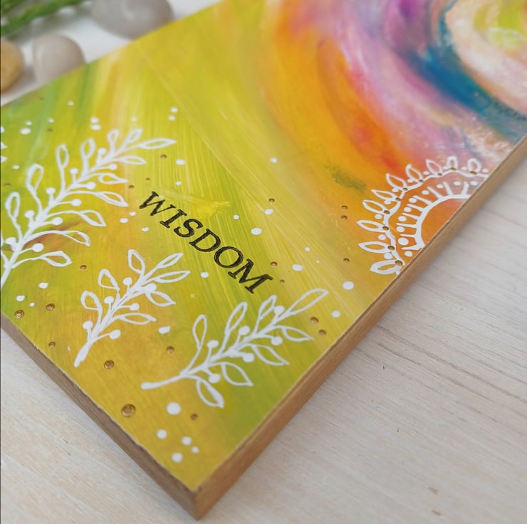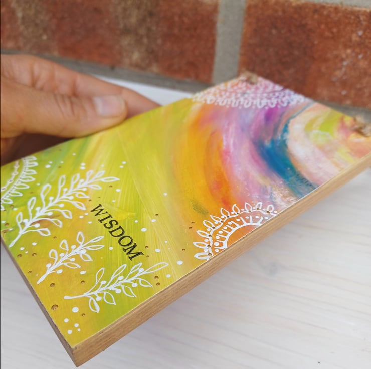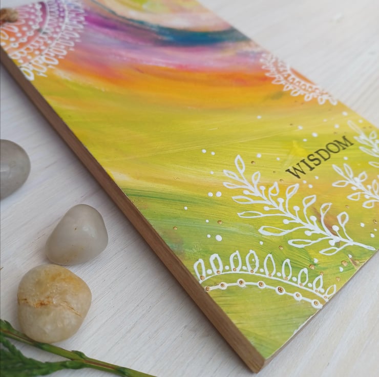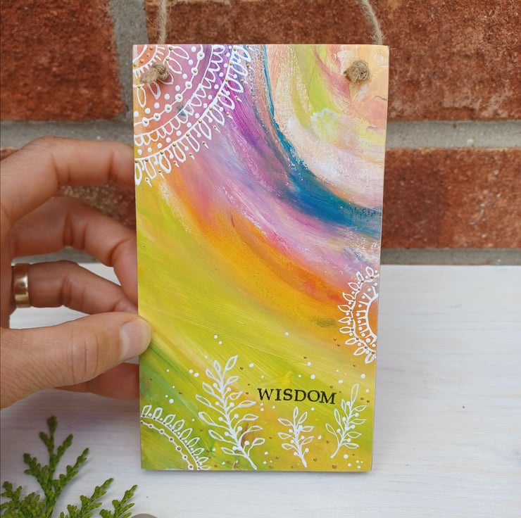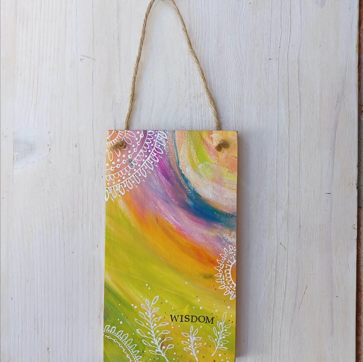 Wisdom. This is a colourful rainbow acrylic painting on upcycled, reclaimed pine wood. It has been cut to size, sanded then drilled. The art work has been painted in lovely rainbow colours with hand painted detailed patterns in white and a touch of gold.