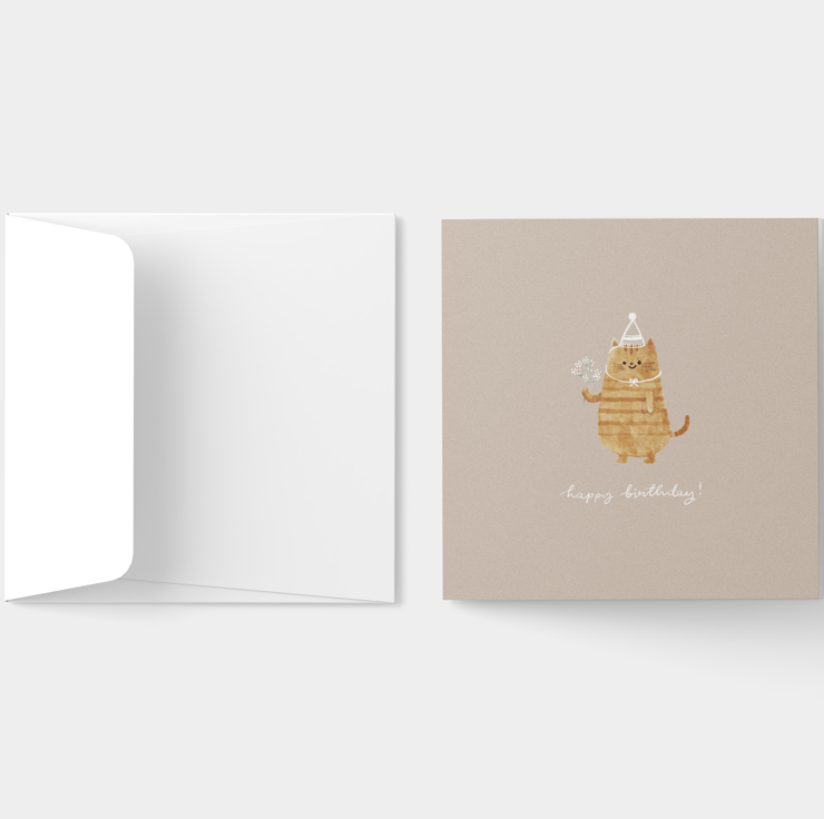 Cute tiger calico cat having a birthday party! Celebrate a loved one's birthday with this cute card.