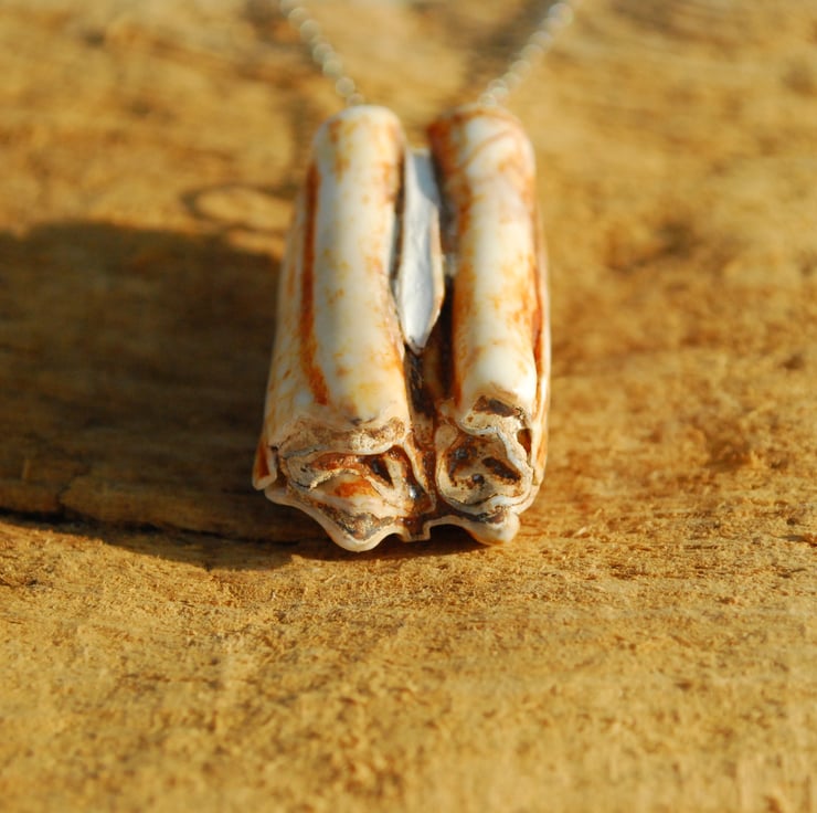 We occasionally find animal teeth on beaches, and this is the biggest we've ever found. Beach teeth have slightly rounded edges and are smooth. This one had cavities which we've filled with tile grout so it won't collect dust. This is an eye-catching and unique pendant.