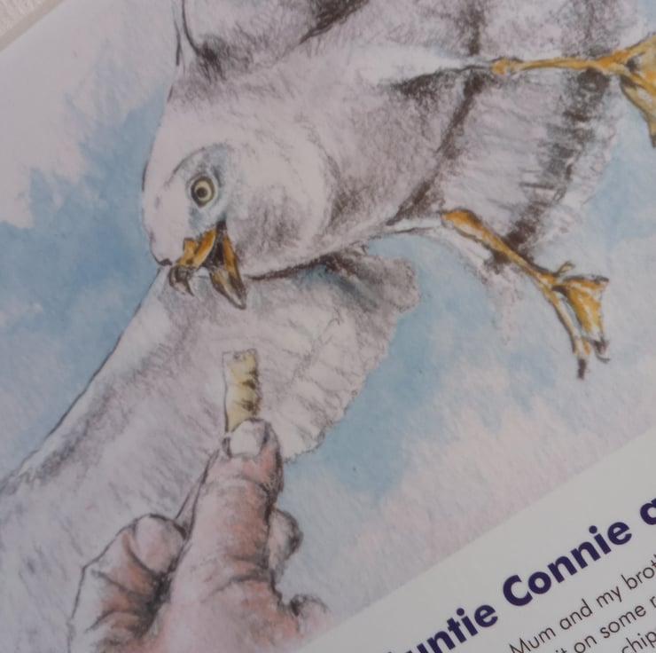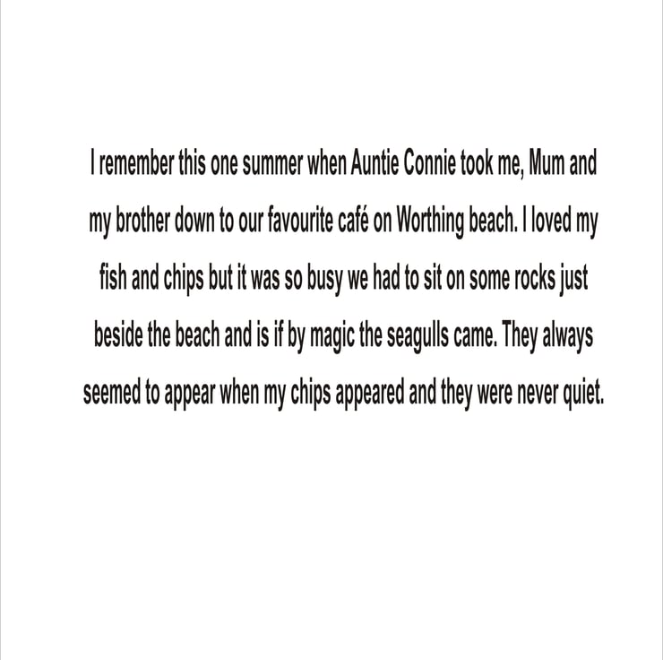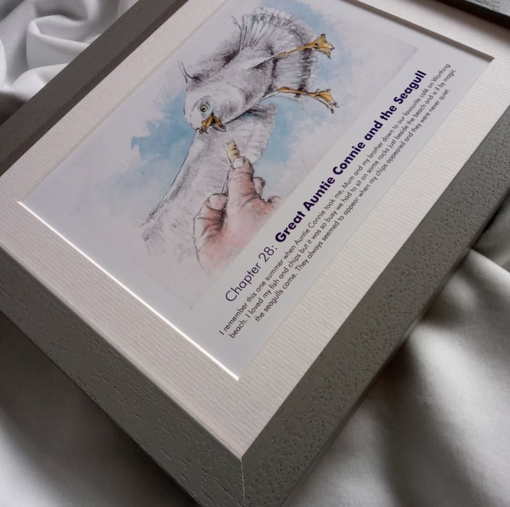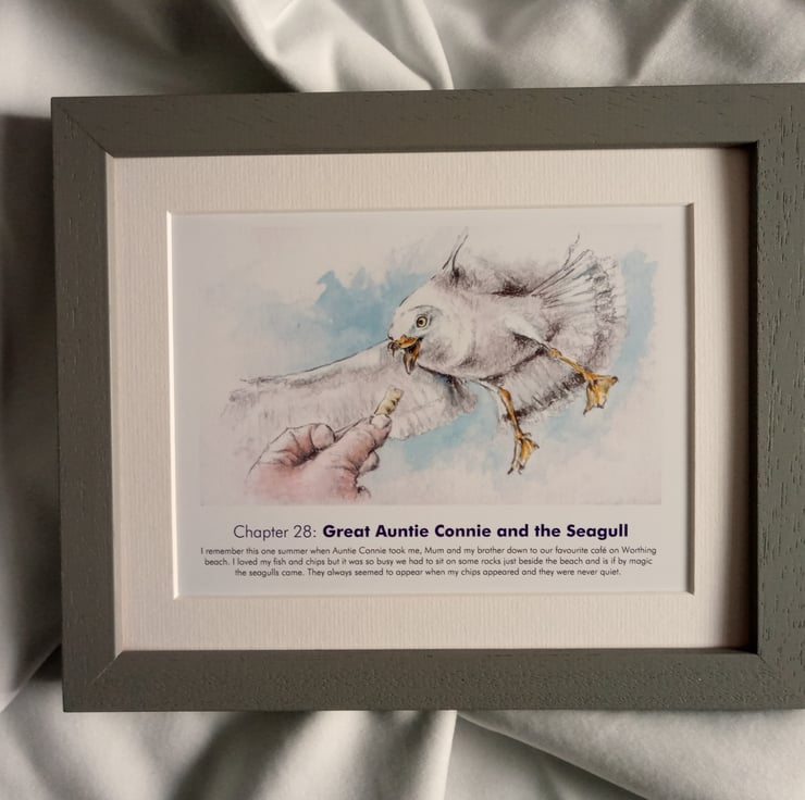 An original illustrated watercolour print of a seagull on Worthing beach Sussex with a short story for charity. 'Every picture tells a story'. Presented and signed in a mounted Grey wooden frame with a grain finish 10" x 8" (print: 8" x 6") 22mm wide and 22mm deep. Also presented unframed, fully mounted ready for your own frame. (10" x 8" Mount-Print 8" x 6")