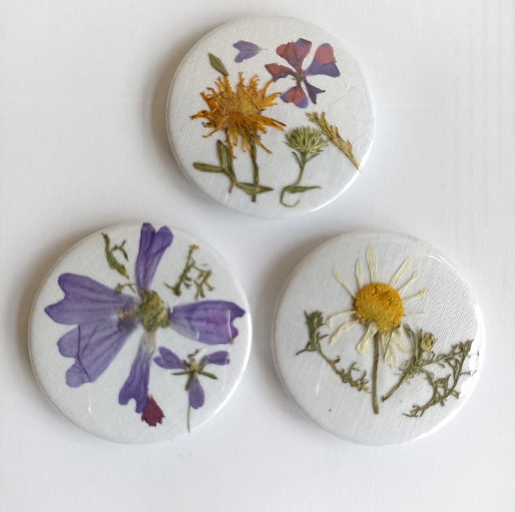 As I walk the dog in the morning through the meadow I noticed the abundance of wild flowers. I I picked a few and pressed them. Then I added some geranium from my garden. Forgetting about them until the begining of Autumn when I was tidying up. I suddenly thought I could make these into magnets, they were too beautiful to keep tucked away in a drawer. Here you have the result! Reminders of sunny days.