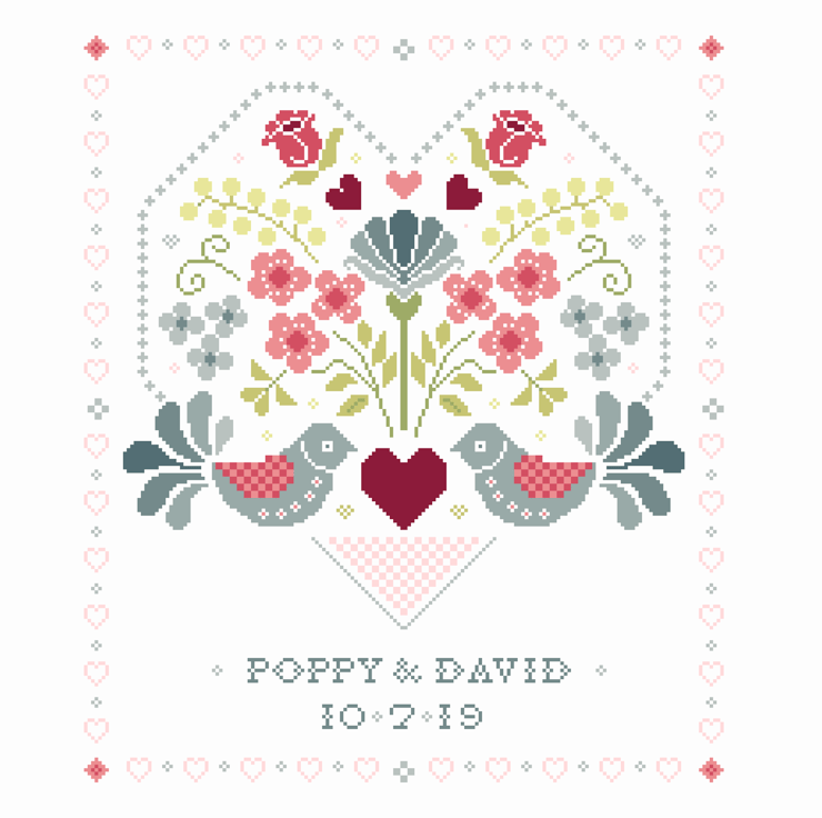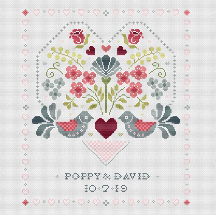 Wonderful traditional folk art Personalised Wedding Sampler, ideal as a wedding gift and inclusive of full alphabet to customise you design. Chart PDF in high resolution and consists of 14 pages of A4.