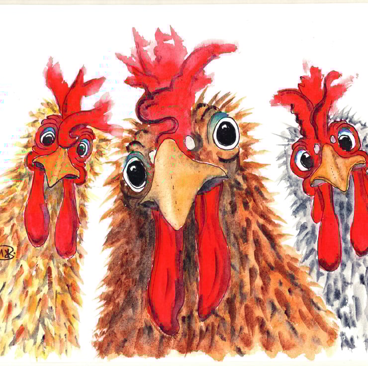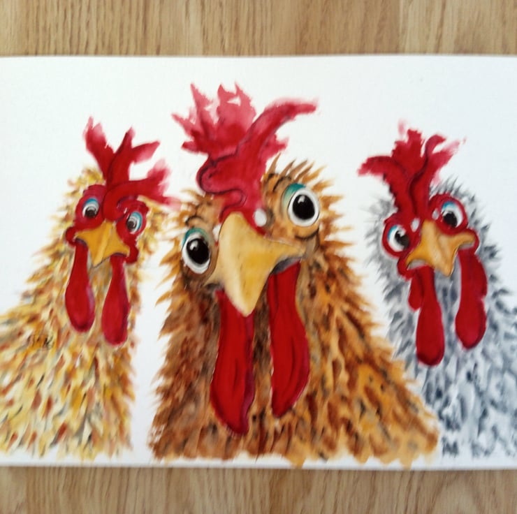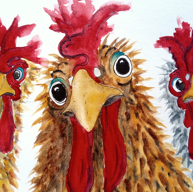 A close-up of three cute chickens/roosters. Nosy chickens. Curious chickens. Farm animals. Hen Party.