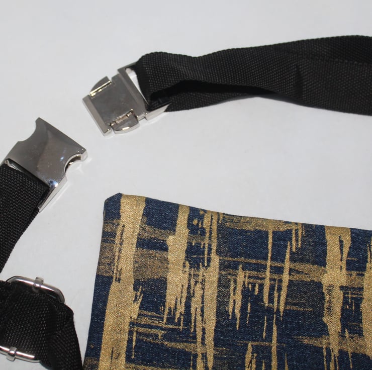 The navy blue denim fabric has been hand-screen printed with my unique abstract print in gold ink.