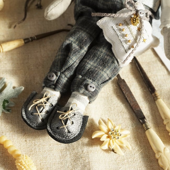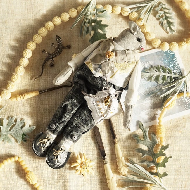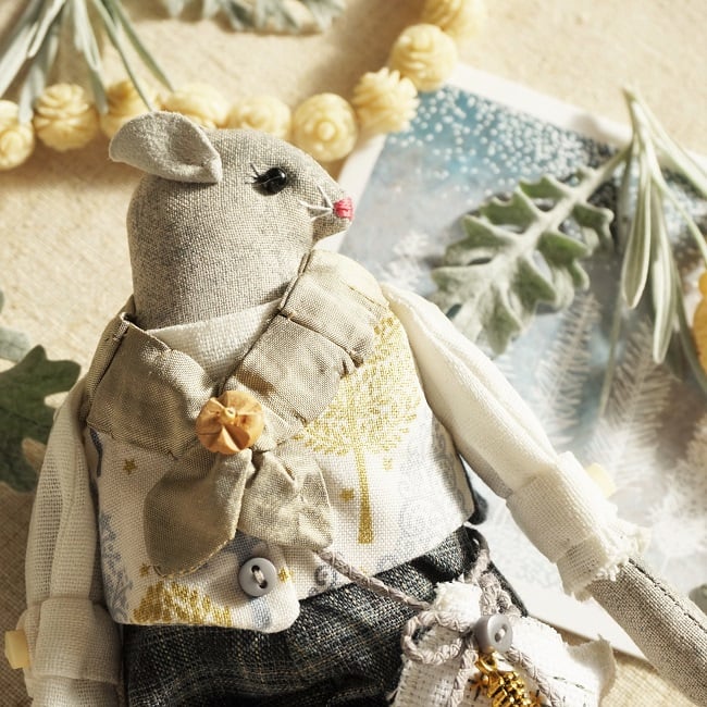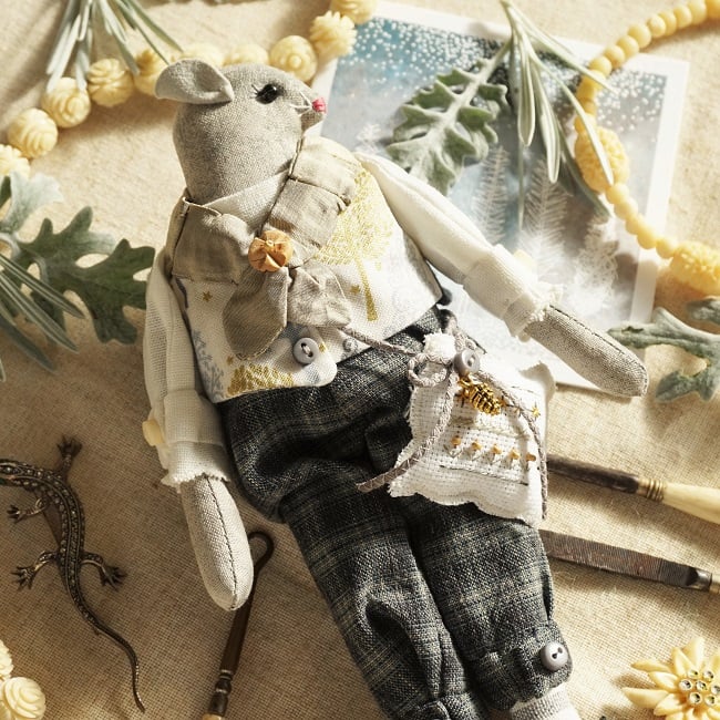 This is Aspen, a tiny frosted forest mouse. He is a hand embroidered mouse with little leather ears and tail. He is dressed in tweedy yarn dyed cotton plus fours with linen shirt and a Frosted Forest print cotton waistcoat. He is finished with tiny buttons, leather shoes and a sampler on his little bag.