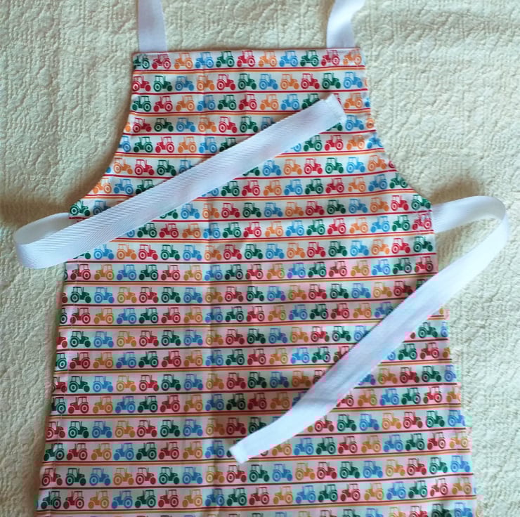 I love this little apron. Made of good quality cotton, it has stripes of tiny tractors in orange, red, green and light blue printed on a creamy-white background. The straps are white acrylic herringbone tape. The apron measures 17.5" (44 cm.) in length and 15" (38 cm.) at the widest point and should fit a child between 2 and 6 years old. It can be machine washed.