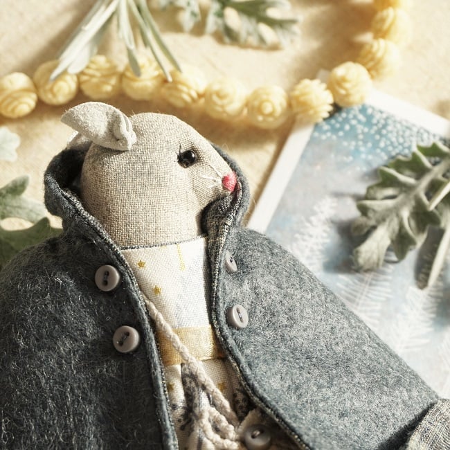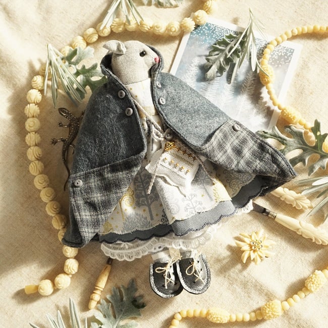 A warm winter cape keeps this little mouse safe from winter chills, lined with blue grey checked yarn dye fabric she looks super snug xx
