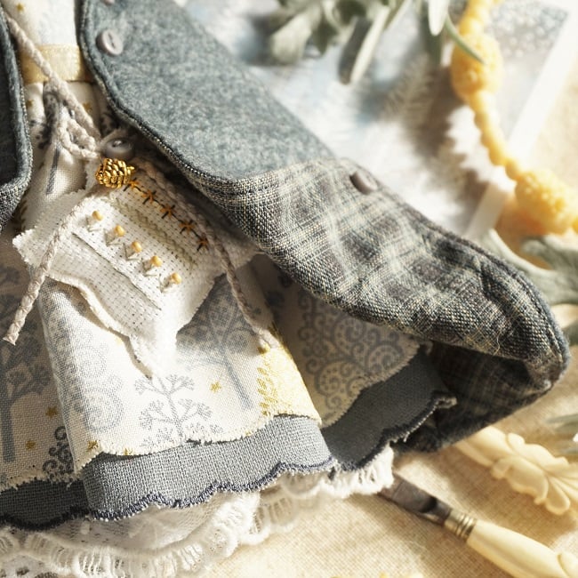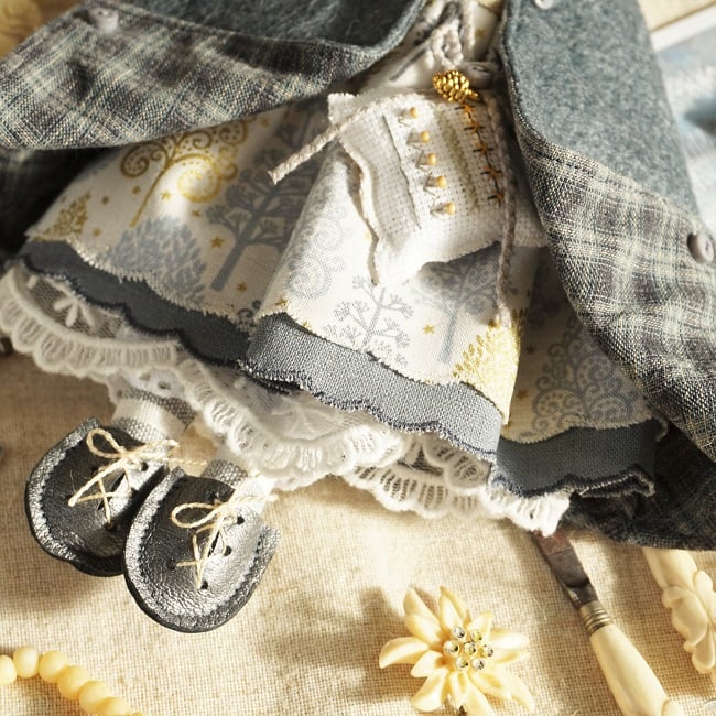 This is Sylanna, a tiny frosted forest Christmas mouse in a wool cape. She is a hand embroidered mouse with little leather ears and tail. She is dressed in a Frosted Forest print, a white ground with trees in a range of greys with golden tones. She has coordinating underskirts in pewter linen, white tulle mesh and White cotton lace bloomers. To keep warm she has a wool cape lined with a Japanese yarn dye cotton. Her dress is finished with organza ribbon, tiny buttons and little leather shoes. She is a grey mouse with grey ears, a white tail with white whiskers and a pink nose with little black bead eyes.