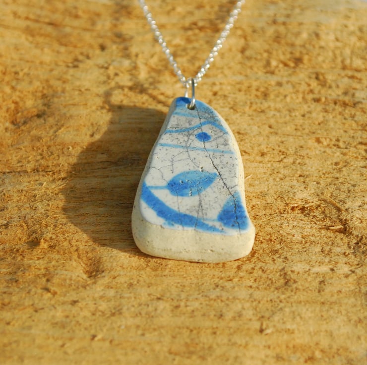 We love the effect that being in the sea has on china - it adds cracks and other colouration which enhances the feeling of age. This piece of pottery has probably come from a tile as it is flat and thick. We have tumbled the pendant so it is rounded and clean. This pendant has a unique quality of appearing to have come from an archeological dig.