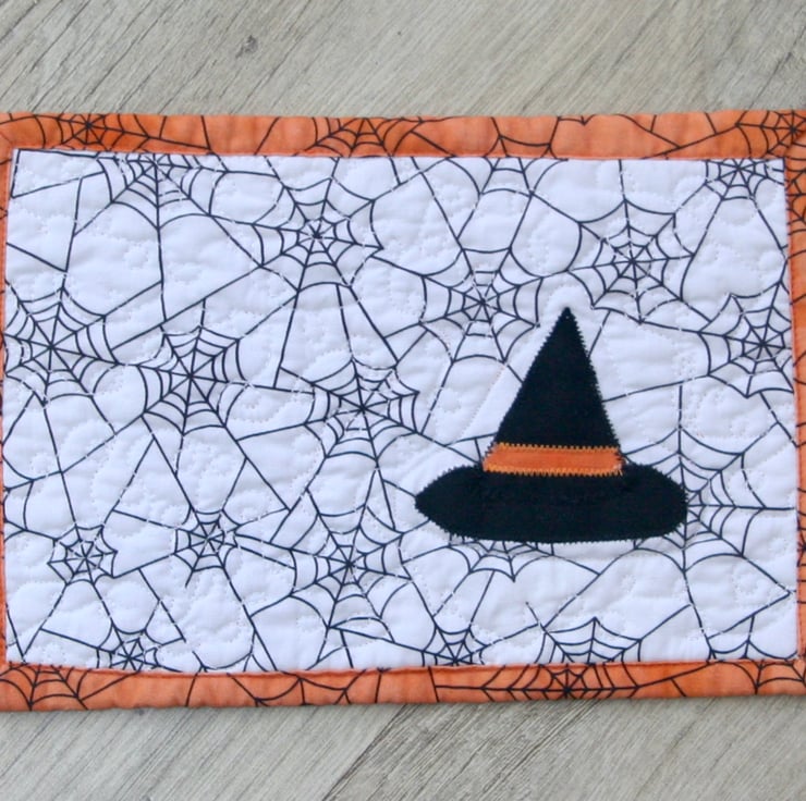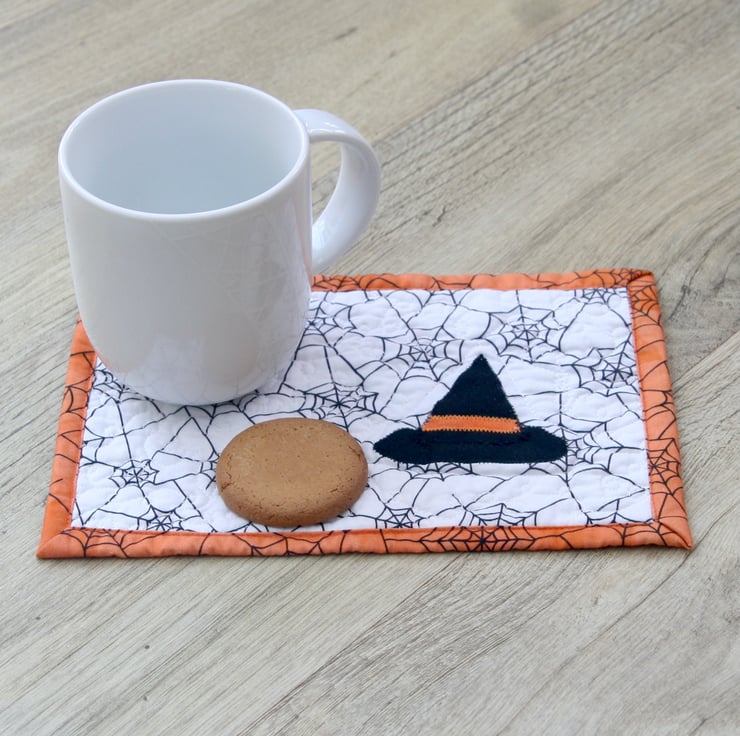 This spooky mug rug, with a Witches Hat, is big enough to accommodate your drink and a cheeky biscuit. Unfortunately the bottom part of the Hat didn't fully adhere when the applique section was originally stitched down and had to be restitched after the mug rug had been completed leaving an extra line of stitching.