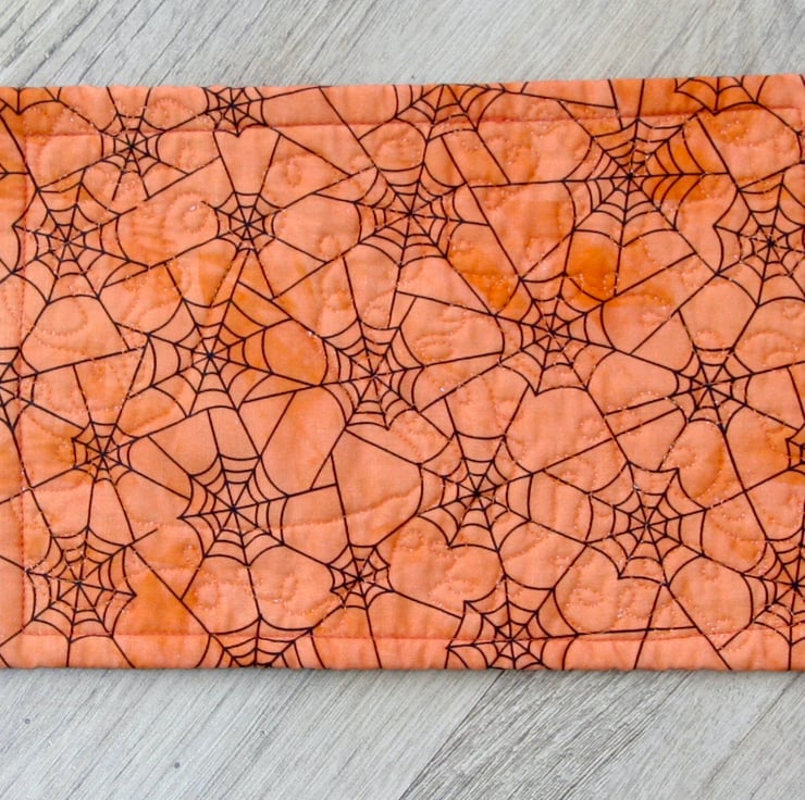 The front is a white fabric covered with spider webs and a Witches Hat appliquéd in the bottom right corner. The backing is orange with the same spider web pattern as the front. The two layers of cotton sandwich an eco-friendly polyester wadding made from recycled plastic bottles. The mug rug is bound with the backing fabric. The three layers are quilted together using a winding loop the loop pattern.