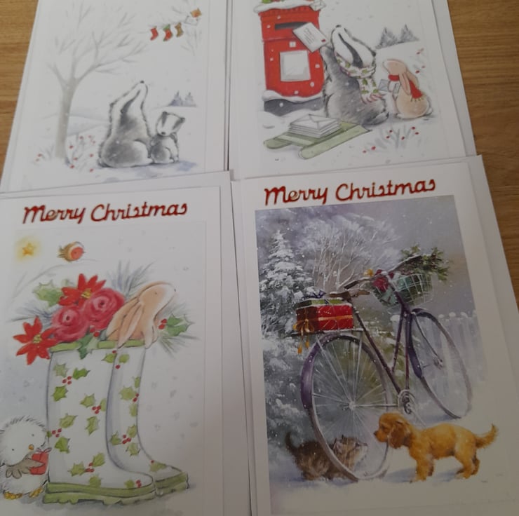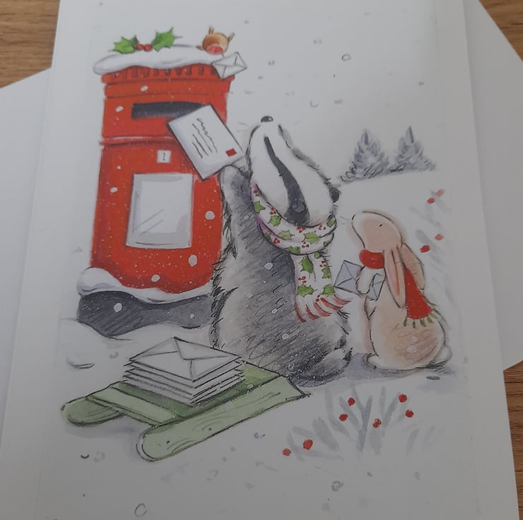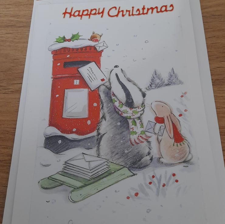 DESIGNED AND HANDMADE BY MYSELF,CUTE CHRISTMAS CARD WITH MR BADGER, MRS RABBIT AND PETER ROBBIN POSTING THERE CHRISTMAS CARDS.