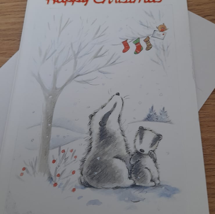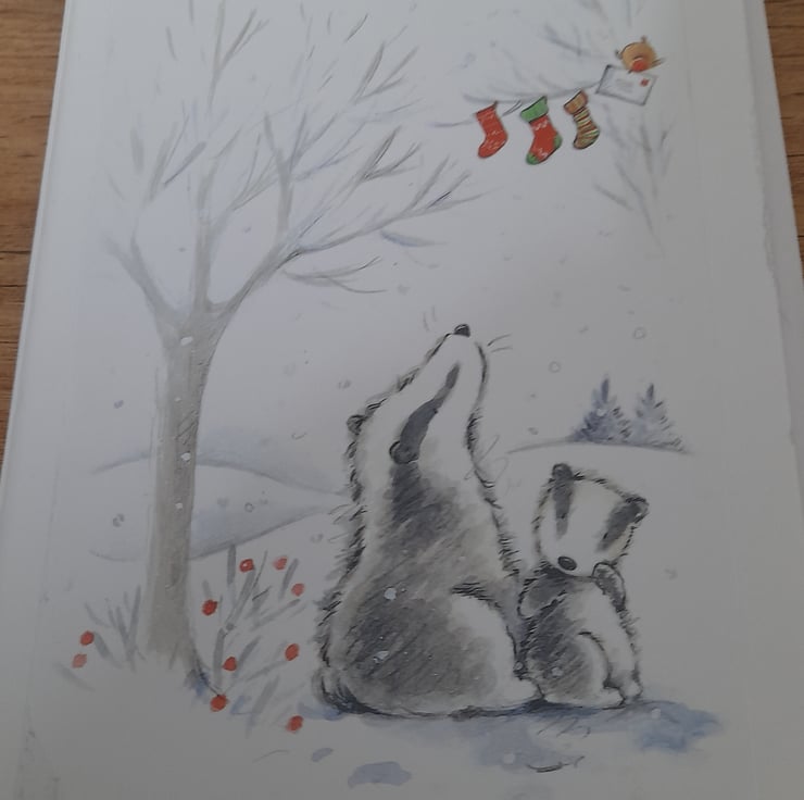 DESIGNED AND HANDMADE BY MYSELF,CUTE CHRISTMAS CARD WITH MR ROBBIN DELIVERING A CHRISTMAS CARD TO MAMMY AND BABY BADGER.
