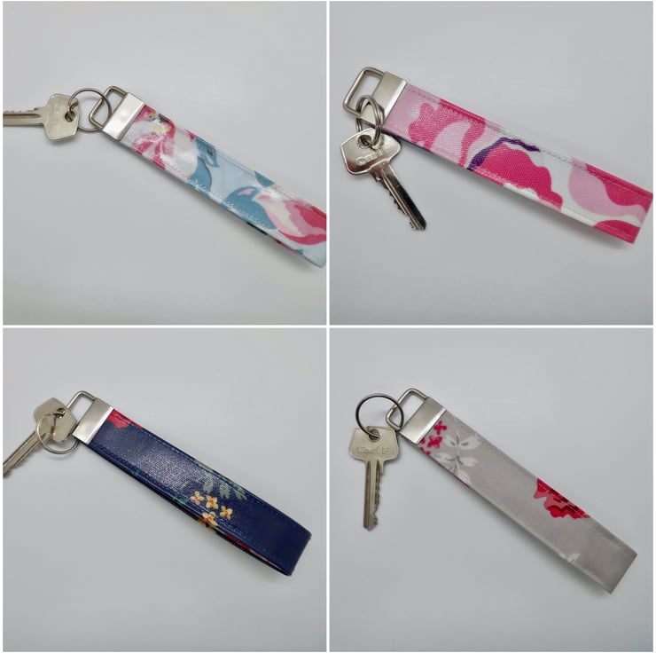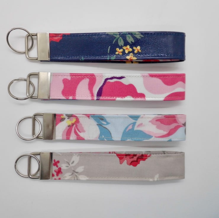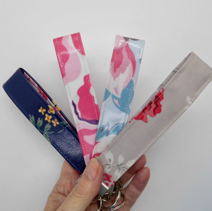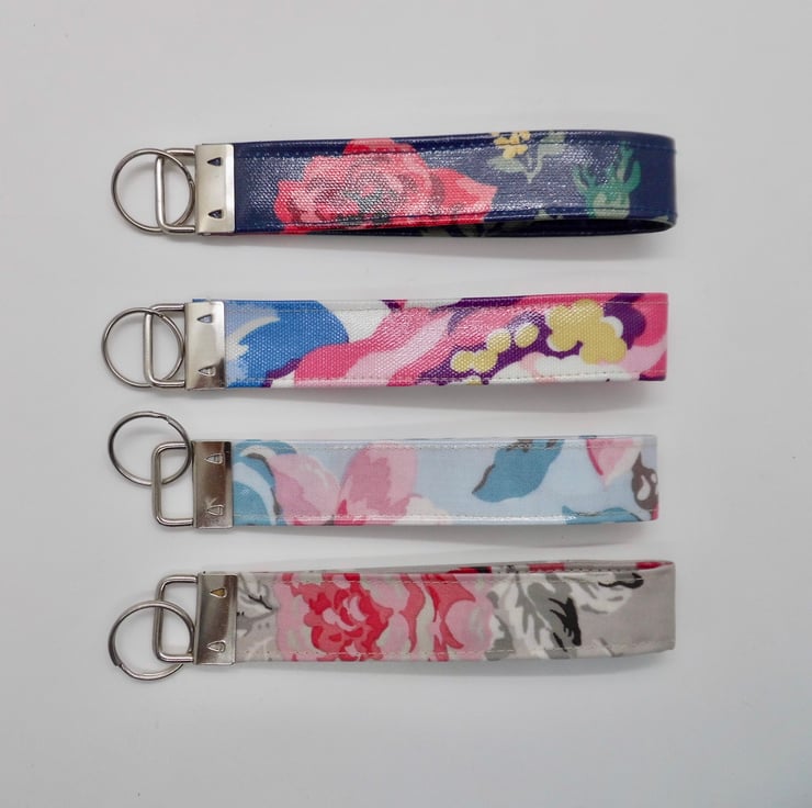 A pack of 4 wrist strap key rings. Made using a selection of Cath Kidston oilcloth fabrics which are strong and wipe-clean as well as very pretty in big floral prints.