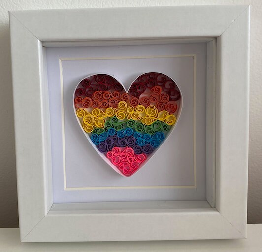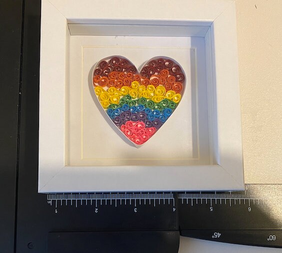 This unique Mini Rainbow QuilledQuilling Love Heart Shadow Box frame is made from small pieces of rolled paper which is an art form called Quilling.