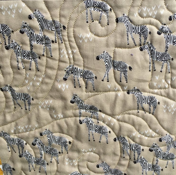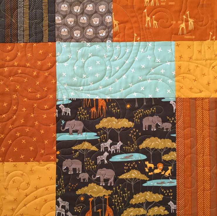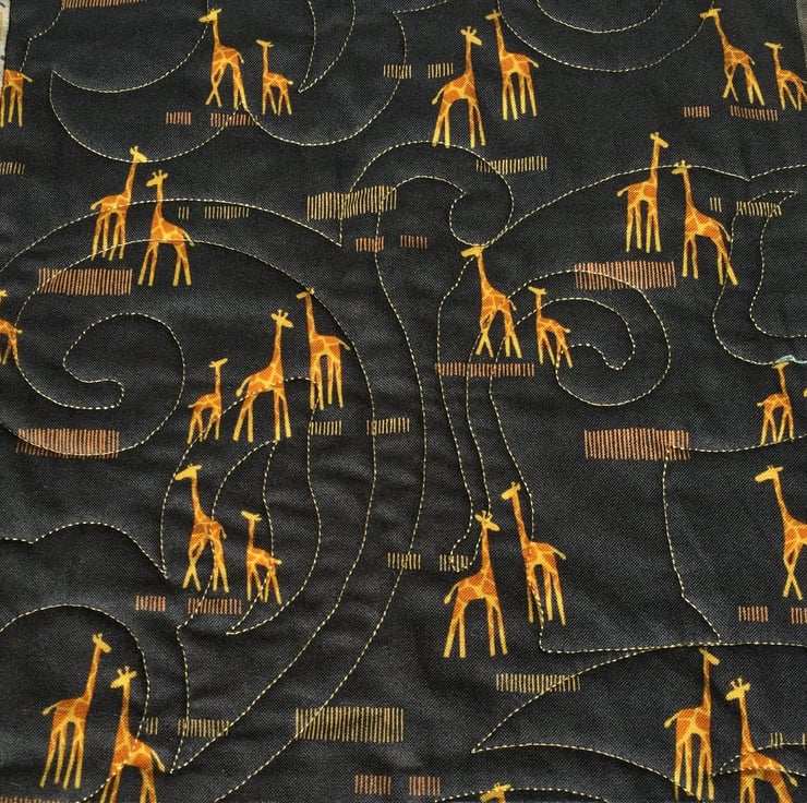 The outer border is Giraffe Family on Black which creates a beautiful dark coloured frame to offset the rich colours in the quilt.