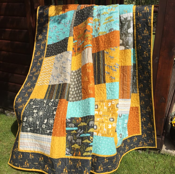 Transport yourself to the plains of Africa with this rich and colourful handmade patchwork quilt in Safari Life fabric. Designed by Stacy lest Hsu for Moda, Safari Life exudes the warm vibrancy and intermingled calls of the African plains.