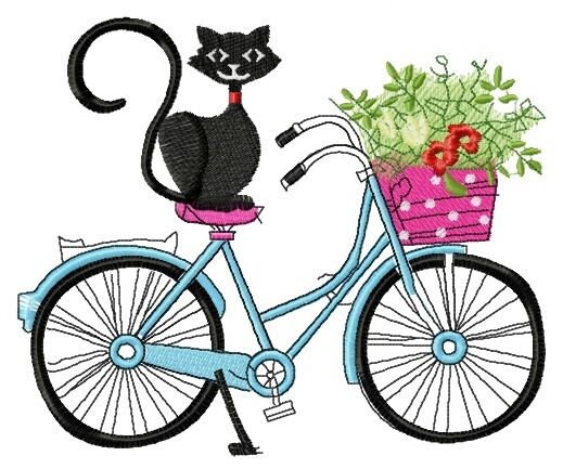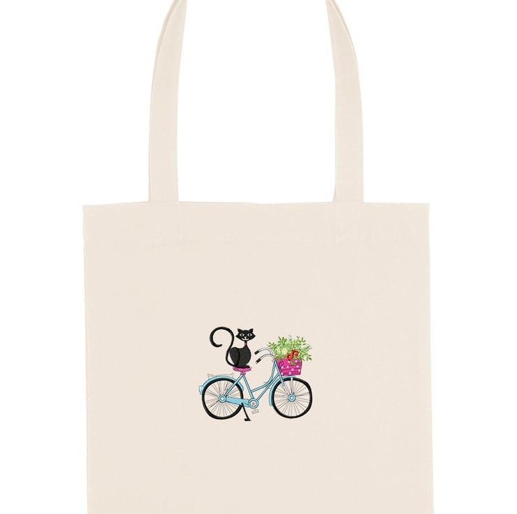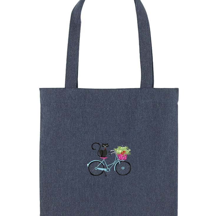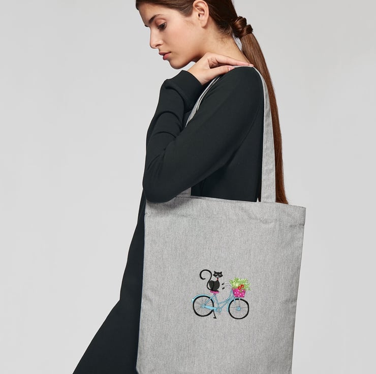 An Organic Recycled Shopper Bag Embroidered with a detailed 'My Cat and My Bike'