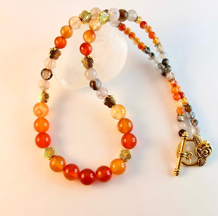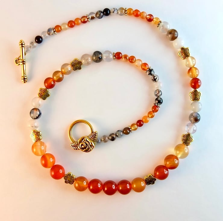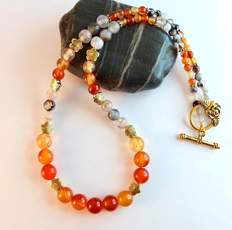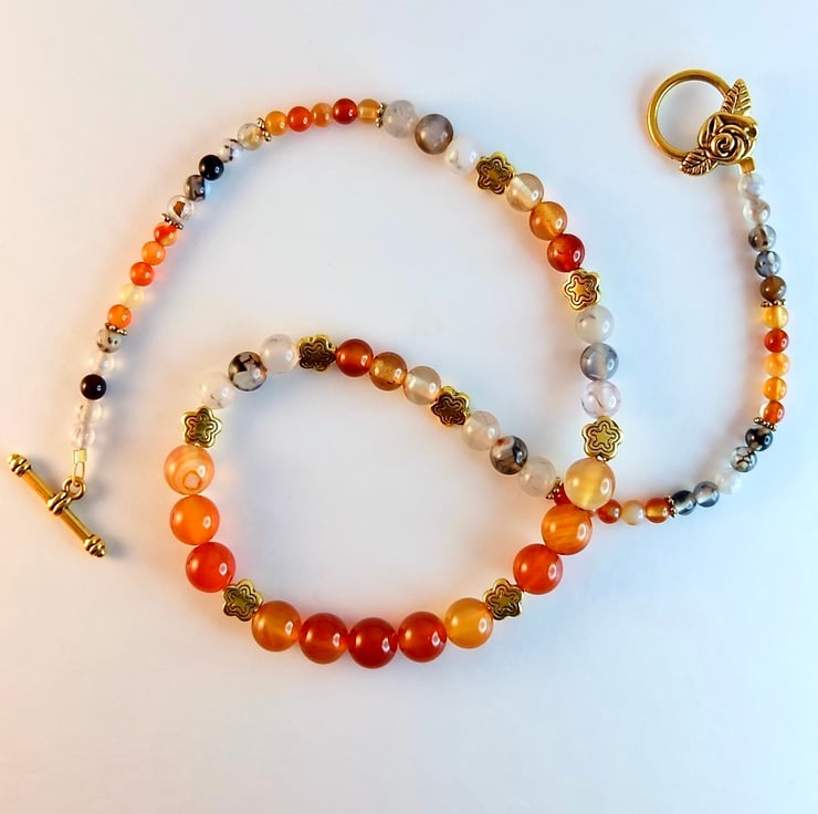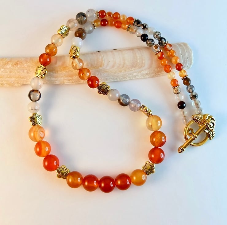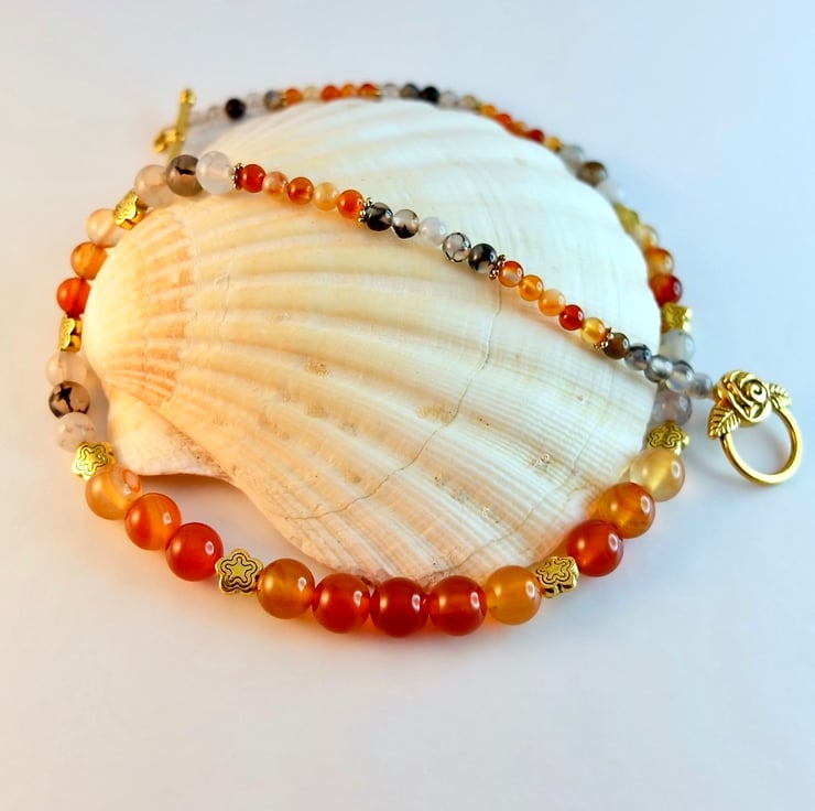 A mix of warm, natural orange Carnelian and light grey dragon vein Agate beads.