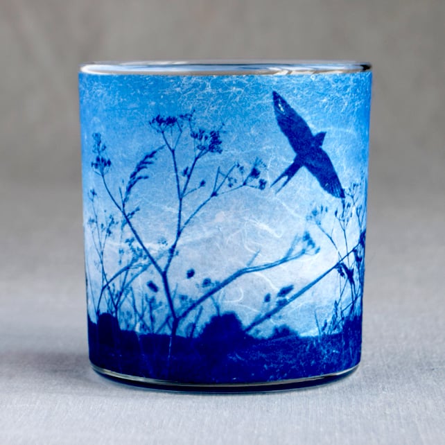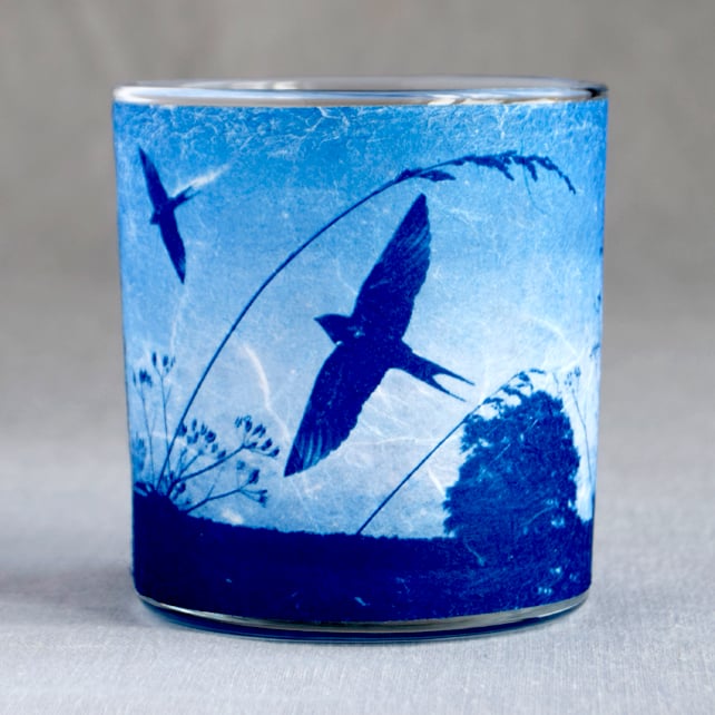 A beautifully translucent Cyanotype on mulberry paper makes this a very special candle holder. When the candle is lit the light flickers through the image bringing the blue skied scene alive with Swallows swooping over trees and meadows