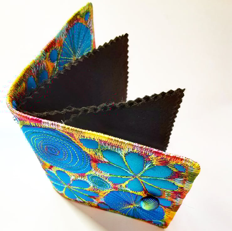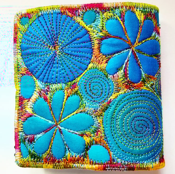 Made from layers of fabric including hand dyed Egyptian cotton and silk fabrics using the free machine embroidery style of sewing