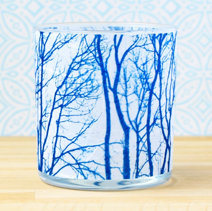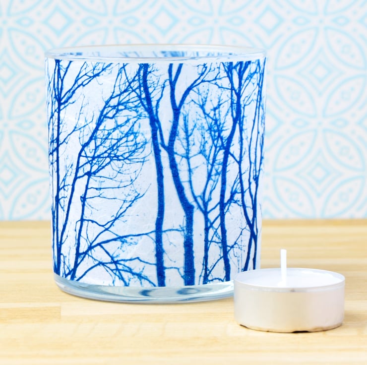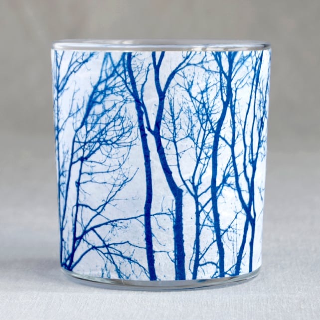 This unique candle holder is created using the old photographic process of Cyanotype. A light sensitive solution is applied to paper, a large format negative laid on then exposed to sunlight, the solution is then rinsed off and the paper dried, fixing the image. To make these candle holders the paper is then applied to glass. The thinness of the paper allows the light to shine through the image.