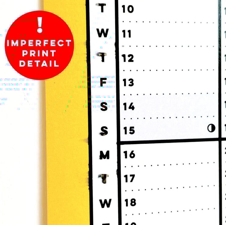 Within the calendar the phases of the moon are depicted with a little circular graphic. Weekends are highlighted with an opaque shade so that it's easy to plot the days of the week.