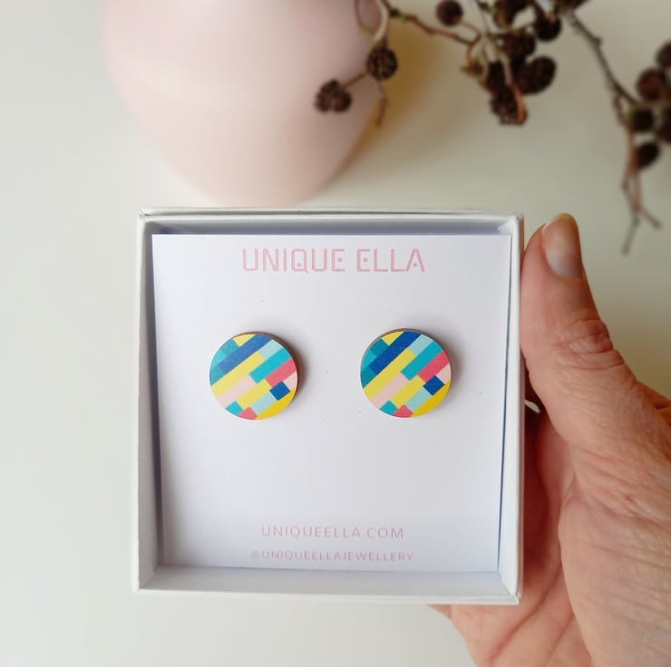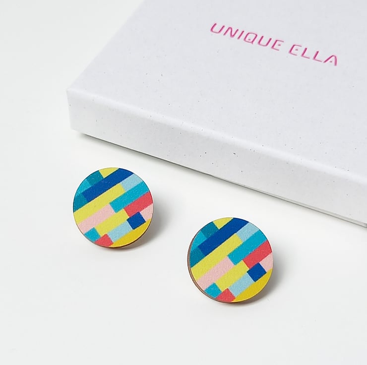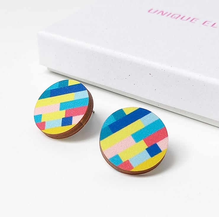 A pair of colourful wooden stud earrings