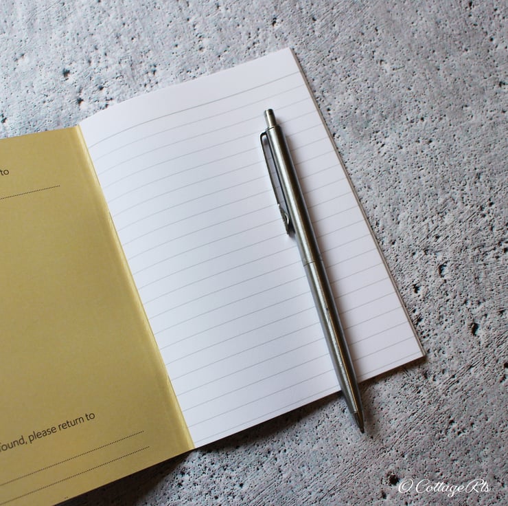 The cover design has been printed on to 300gsm smooth white card, while the inside pages are 90gsm and lined. In total the notebook has 24 pages, so 48 usable sides. There is also space to write on the inside cover who the notebook belongs to and details for return if the notebook is lost. The spine has been bound by two silver staples.