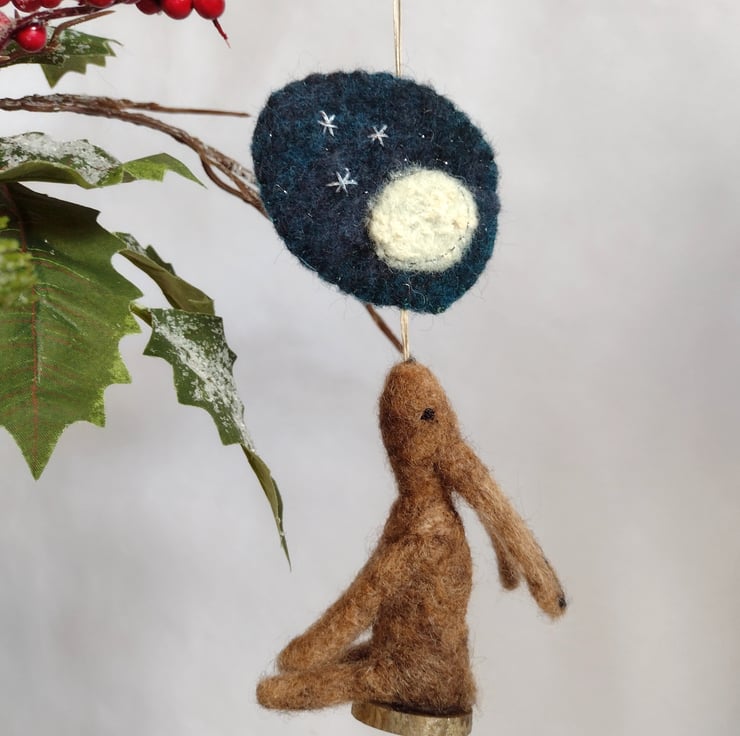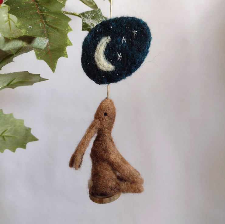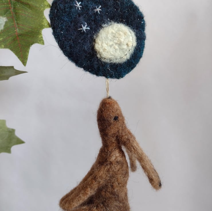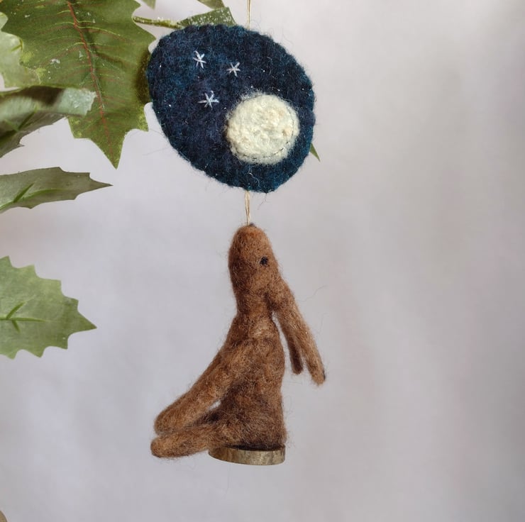 Naive, hand felted, moon gazing hare decoration