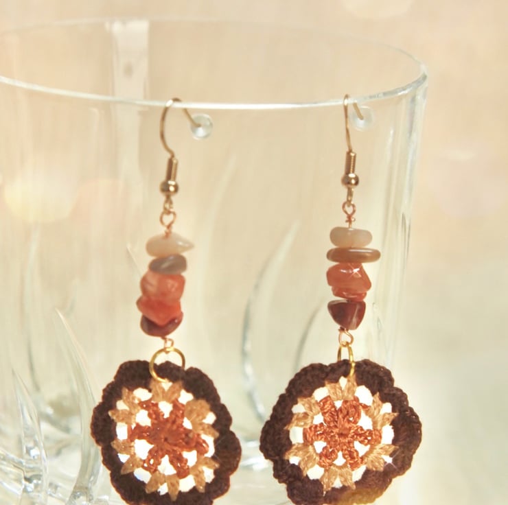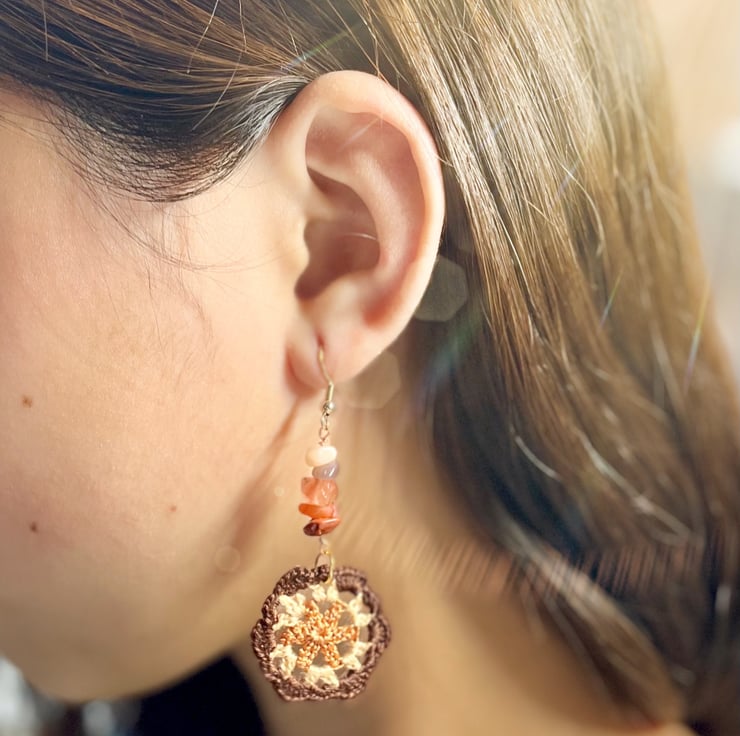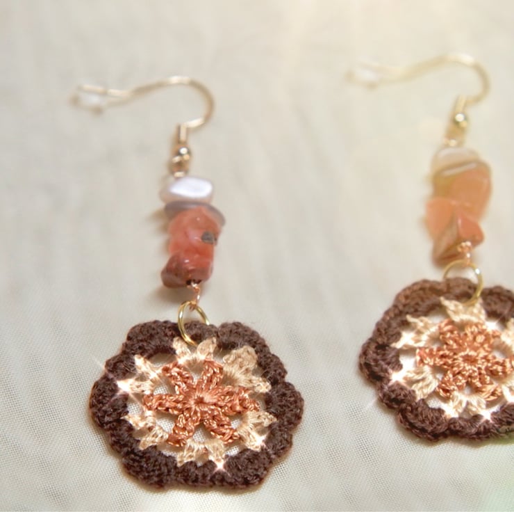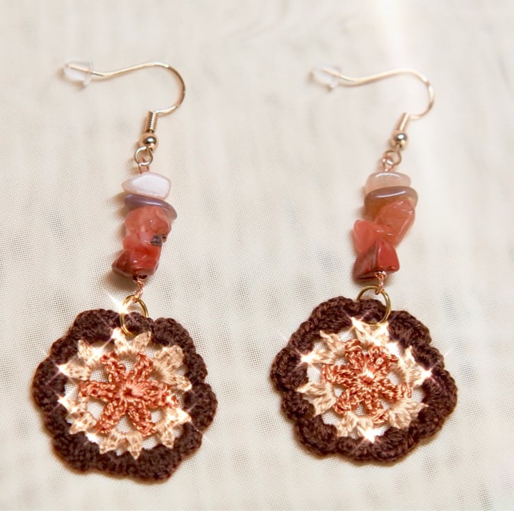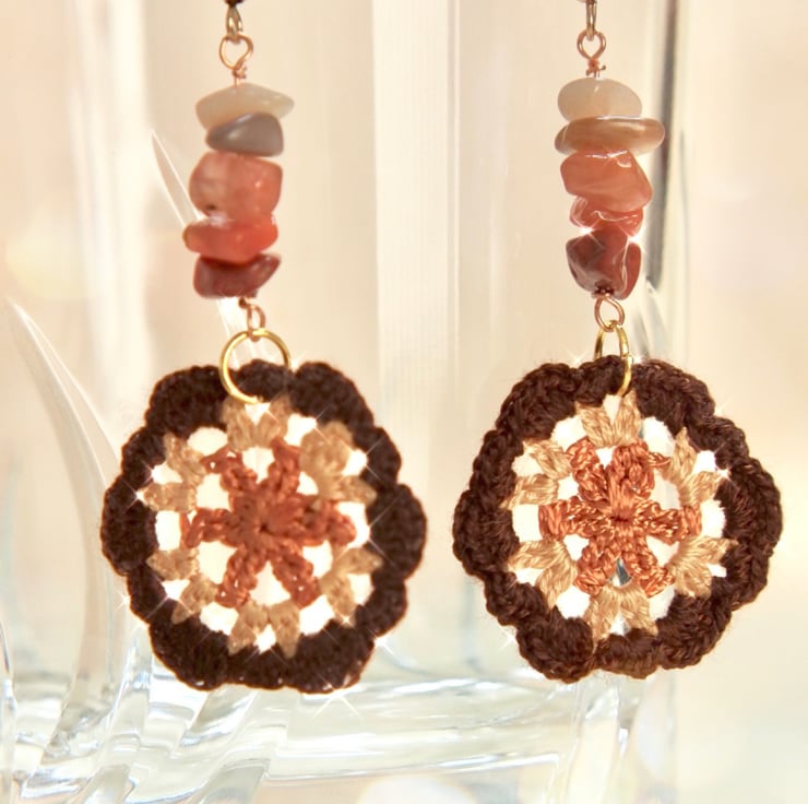 Microcrochet earrings made with Red Jasper, sunstone nuggets and Embroidery Threads.