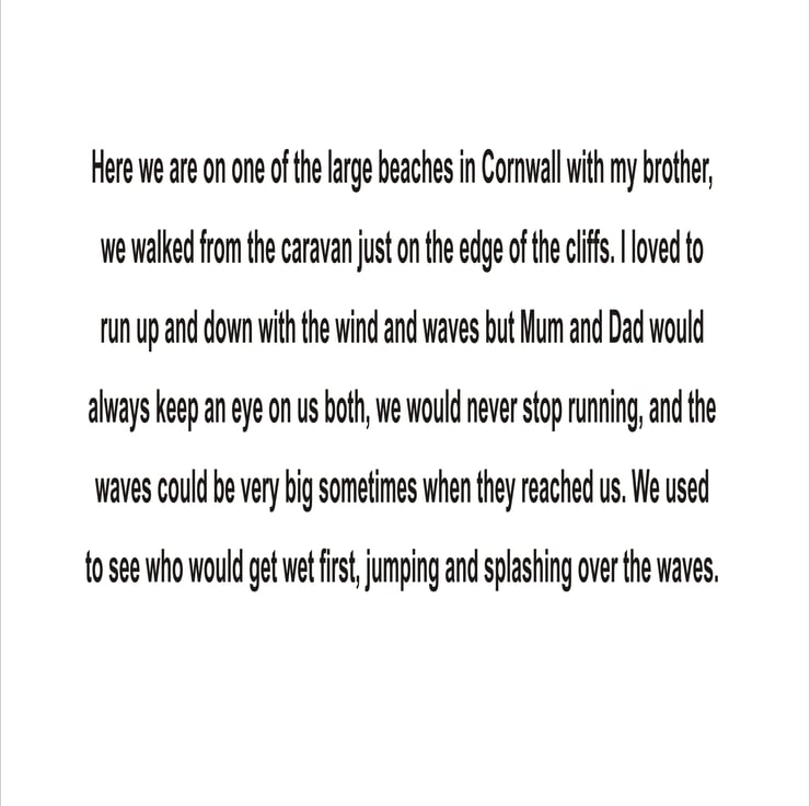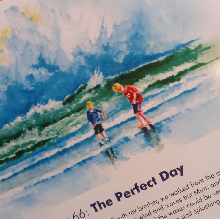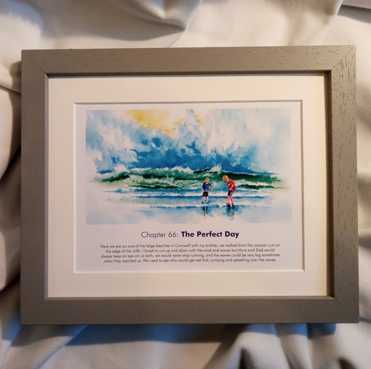 An original illustrated watercolour print of children on a Cornwall Beach with a short story for charity. 'Every picture tells a story'. Presented and signed in a mounted Grey wooden frame with a grain finish 10" x 8" (print: 8" x 6") 22mm wide and 22mm deep. Also presented unframed, fully mounted ready for your own frame. (10" x 8" Mount-Print 8" x 6")