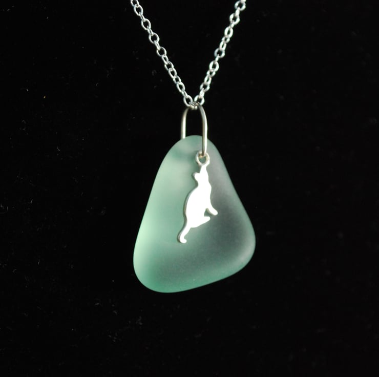 Thick pieces of aquamarine beach glass come from old bottles such as lemonade bottles, which had to withstand the pressure of the fizzy contents. They are typically curved, so make perfect backdrops for charms. This pendant is an especially beautiful piece, which we have tumbled so it is finely frosted and catches the light wonderfully. In front of the glass is a pretty little sterling silver cat charm.