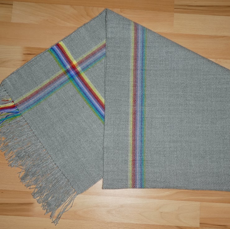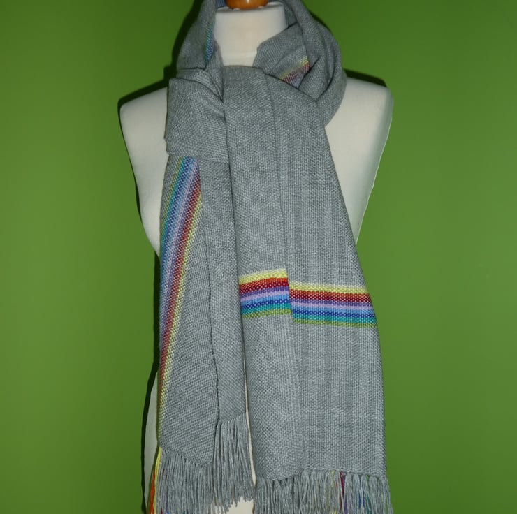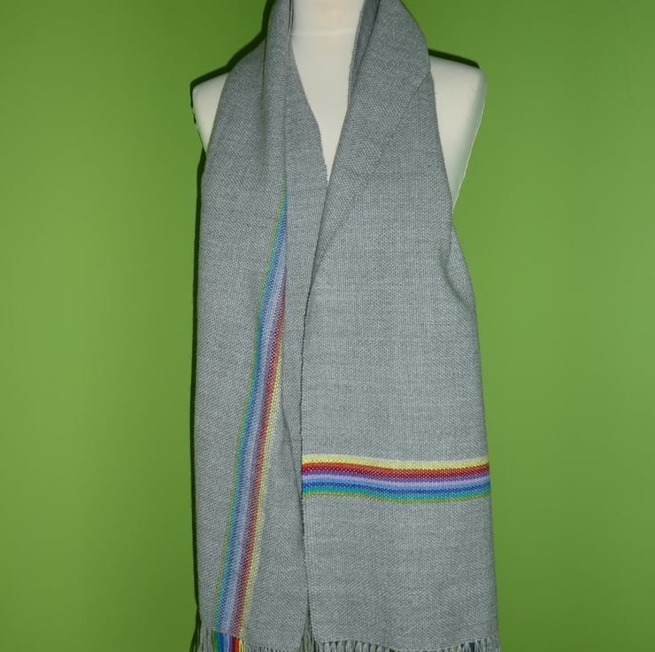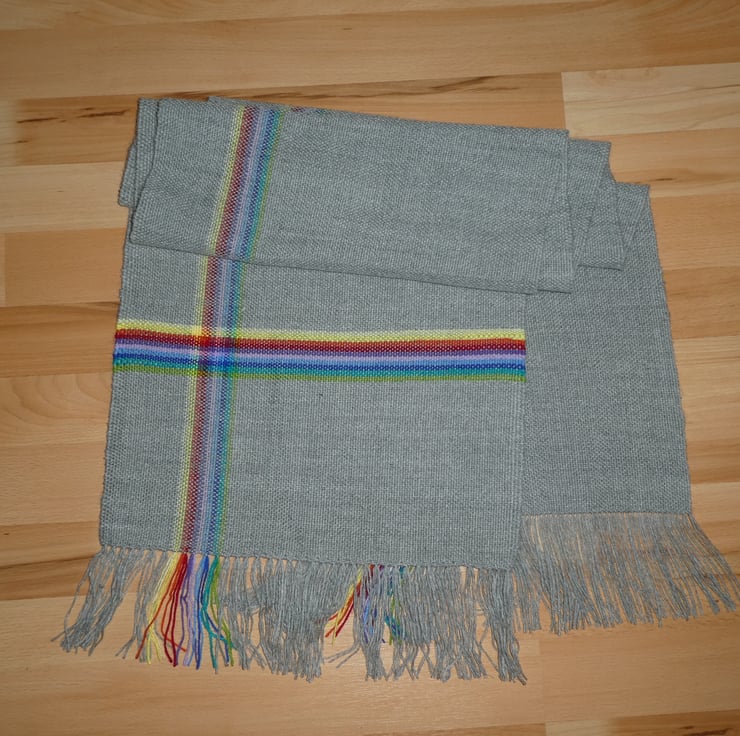 I have hand woven this fantastic scarf on my rigid heddle loom. The scarf measures 76" in total length. The woven fabric is 68", with 4" of tassels at each end. The width is 14". I have used a premium acrylic 4 ply yarn for the scarf, complemented with one horizontal, and a vertical stripe in rainbow colours.