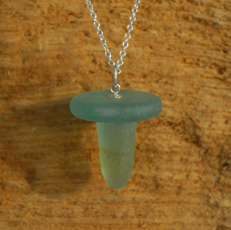 Aquamarine glass bottles were common before white glass could be make cheaply enough. Early bottles has stoppers such as this one, rather than screw tops. This is a perfect one we found on the beach, and tumbled so it is rounded and smooth. It has attractive bubbles, also typical of old glass, and some colour variation.