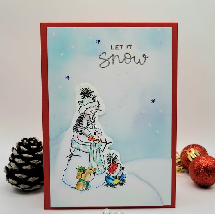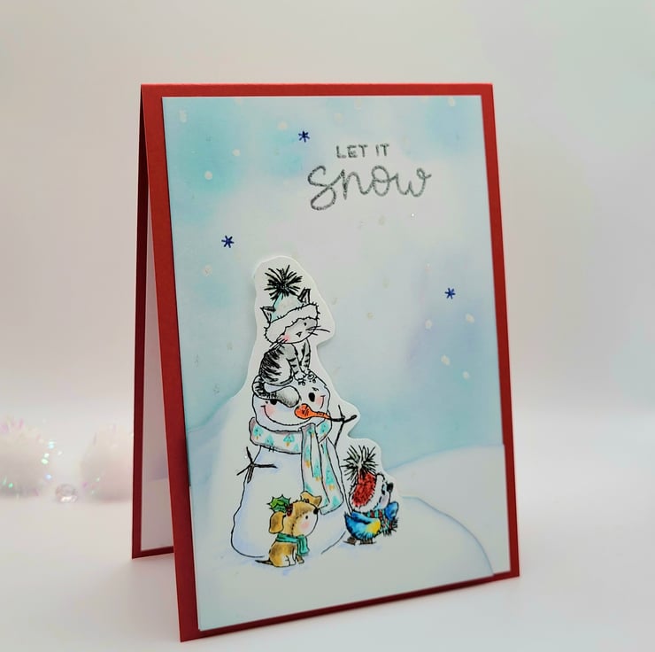 The card base is handmade from quality red card and the layered white panel has been embossed with snowfall and ink blended. A silver embossed sentiment reads LET IT SNOW. The cute characters are stamped and coloured with artist grade coloured pencils and cut out by hand. The little characters on the snow are popped up on slim foam tape for depth.