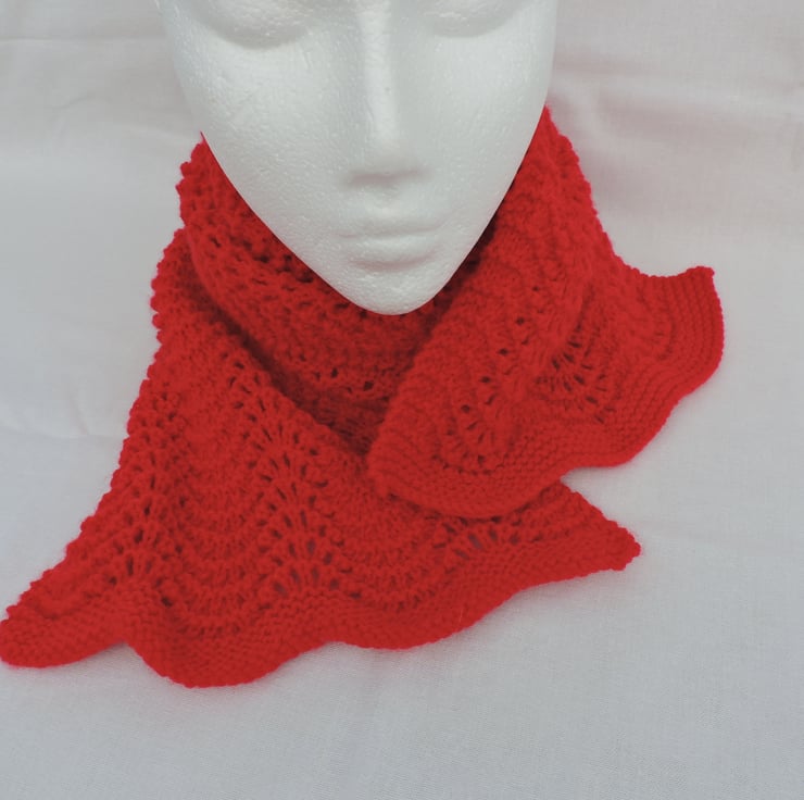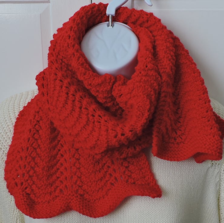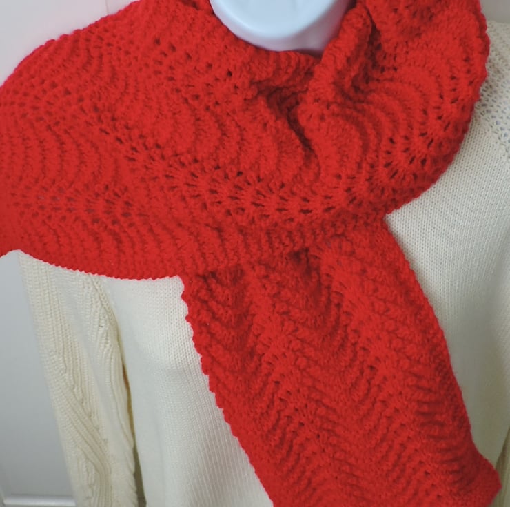 A Seconds Sunday end of line colour. Thls scarf has been knitted with a double knit acrylic yarn. Striking fire engine red colour . A pretty lacy wavy pattern with scalloped ends. A beautifully soft and warm scarf.