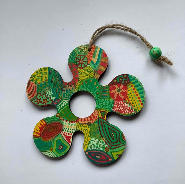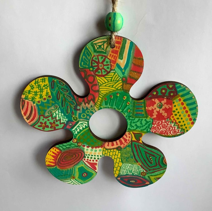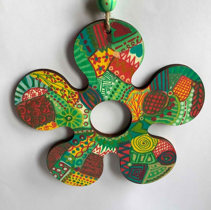 This wooden flower is a lovely wee gift that’s just a bit unique. It is hand painted with doodle art using an abundance of colours on both sides.