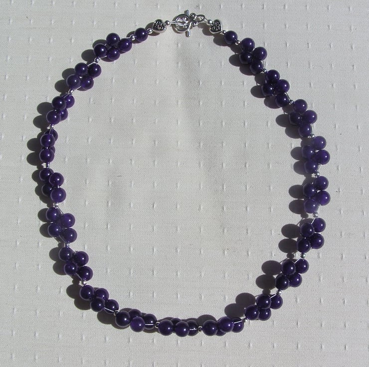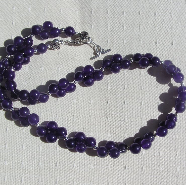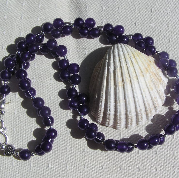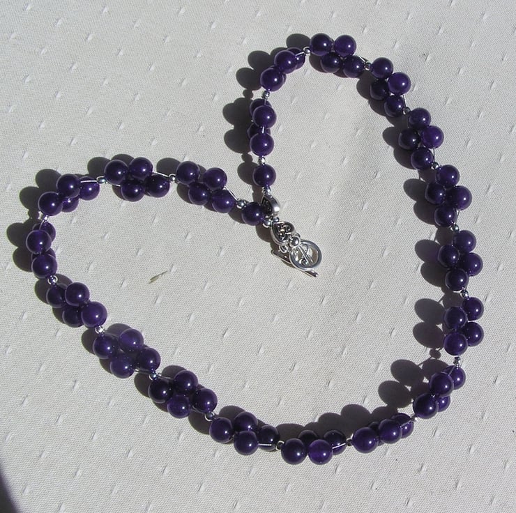 This Stunning Necklace is made wholly from Amethyst round beads clustered together in four's and for that added bit of sparkle tiny Silver spacer beads - a Gorgeous Regal effect that will look stunning either worn casually or with something more Elegant for a Special Evening out